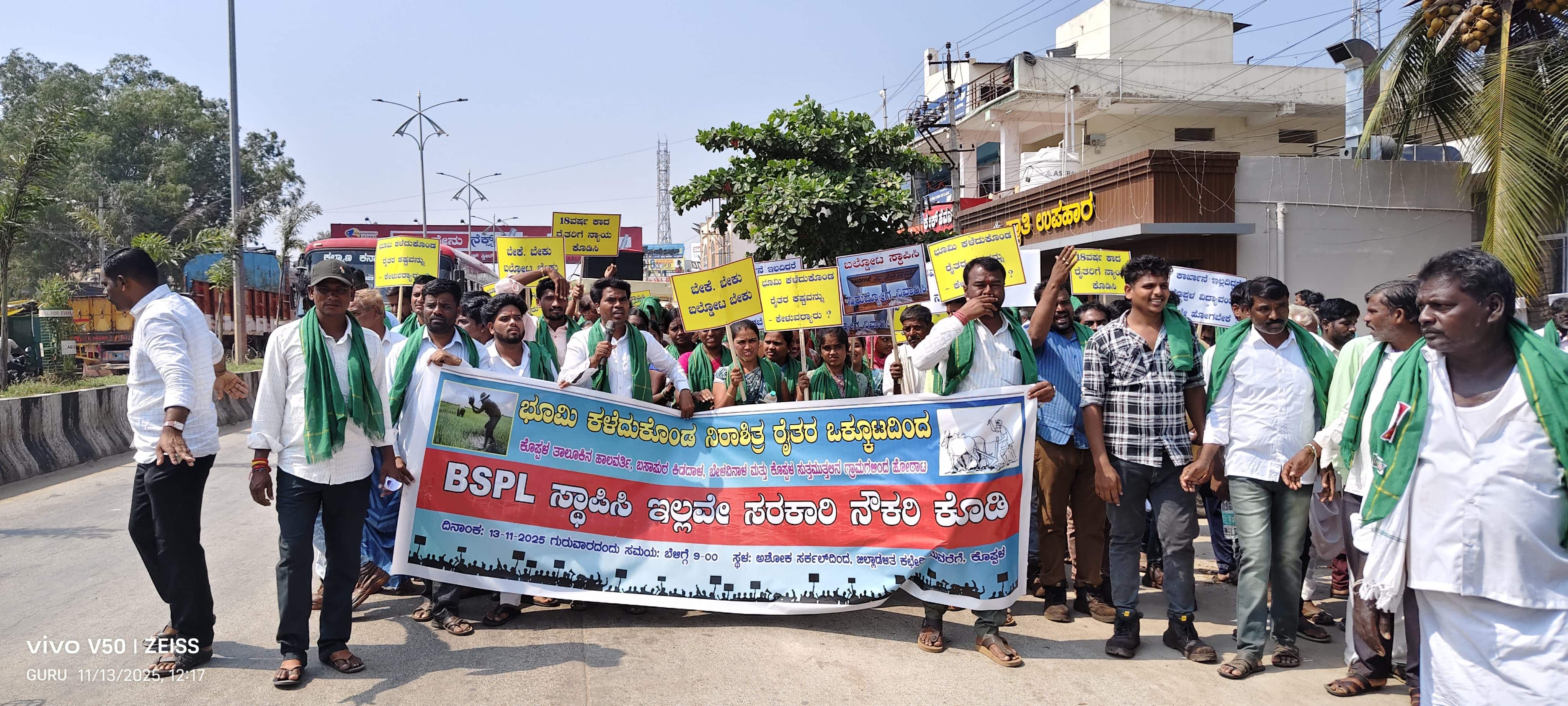 ಕೊಪ್ಪಳ: ಬಿಎಸ್ ಪಿಎಲ್ ಕಾರ್ಖಾನೆ ಸ್ಥಾಪಿಸಬೇಕು ಇಲ್ಲವೇ ಅದಕ್ಕಾಗಿ ಭೂಮಿ ಕಳೆದುಕೊಂಡ ರೈತರಿಗೆ ಸರ್ಕಾರಿ ಕೆಲಸವನ್ನಾದರೂ ನೀಡಿ ಎಂದು ಬಿಎಸ್ ಪಿಎಲ್ ಕಾರ್ಖಾನೆಗೆ ಭೂಮಿ ಕಳೆದುಕೊಂಡಿರುವ ಹಾಲವರ್ತಿ, ಬಸಾಪುರ ಕಿಡದಾಳ, ಬೇಳವಿನಾಳ ಮತ್ತು ಕೊಪ್ಪಳ ರೈತರು ನಗರದಲ್ಲಿ ಪ್ರತಿಭಟನೆ ನಡೆಸಿದರು.