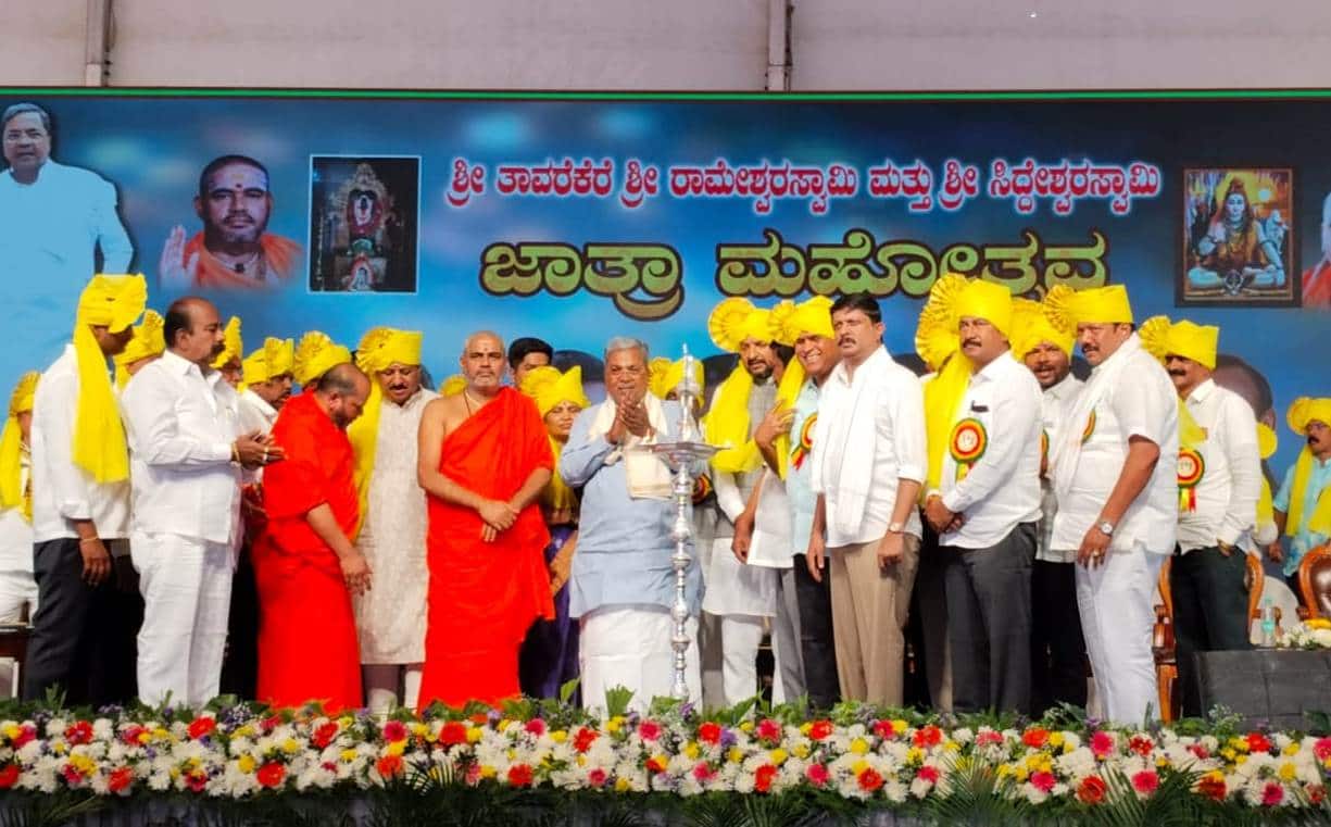 2: ಹೊಸಕೋಟೆ ತಾಲೂಕಿನ ತಾವರೆಕೆರೆ ಗ್ರಾಮದಲ್ಲಿ ಶ್ರೀ ರಾಮೇಶ್ವರ ಹಾಗೂ ಸಿದ್ದೇಶ್ವರ ಸ್ವಾಮಿ ಜಾತ್ರೆ ವೇದಿಕೆ ಕಾರ್ಯಕ್ರಮವನ್ನು ಸಿಎಂ ಸಿದ್ದರಾಮಯ್ಯ ಉದ್ಘಾಟಿಸಿದರು.3: ಸಿಎಂ ಸಿದ್ದರಾಮಯ್ಯ ಅವರಿಗೆ ಬೆಳ್ಳಿ ಗದೆ ನೀಡಿ ನಗರಾಭಿವೃದ್ದಿ ಸಚಿವ ಭೈರತಿ ಸುರೇಶ್ ಅಭಿನಂದಿಸಿದರು.