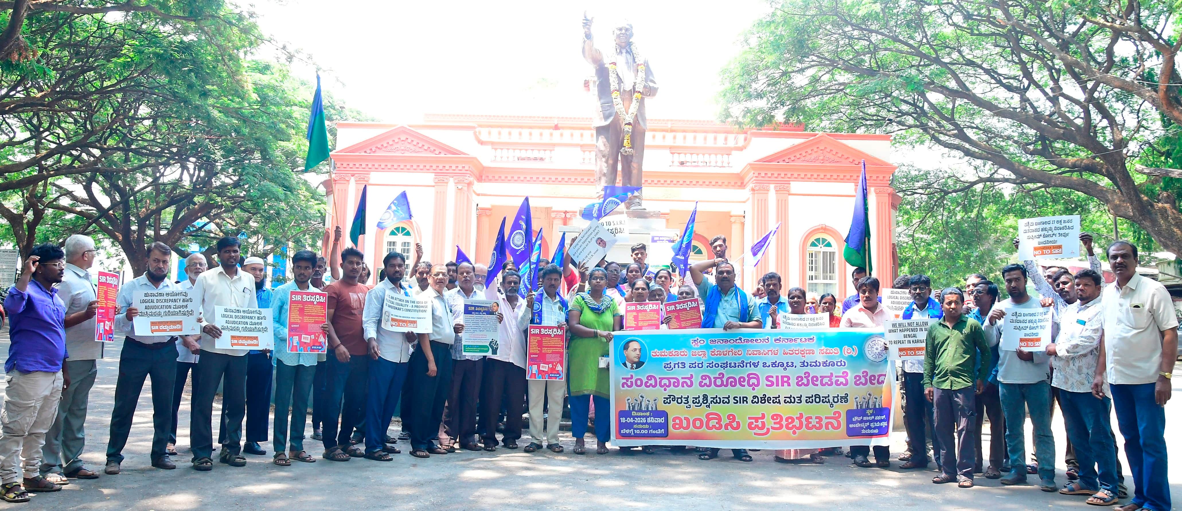 ವಿಶೇಷ ಮತತೀರ್ವ ಪರಿಷ್ಕಕರಣೆ (ಎಸ್ಐಆರ್) ವಿರೋಧಿಸಿ ಪ್ರಗತಿಪರ ಸಂಘಟನೆಗಳ ಒಕ್ಕೂಟ, ಸ್ಲಂ ಜನಾಂದೋಲನ ಕರ್ನಾಟಕ ಮತ್ತು ತುಮಕೂರು ಜಿಲ್ಲಾ ಕೊಳಗೇರಿ ನಿವಾಸಿಗಳ ಹಿತರಕ್ಷಣಾ ಸಮಿತಿ ಆಶ್ರಯದಲ್ಲಿ ನಗರದ ಟೌನ್ಹಾಲ್ನ ಅಂಬೇಡ್ಕರ್ರವರ ಪ್ರತಿಮೆ ಹತ್ತಿರ ಪ್ರತಿಭಟನೆಯನ್ನು ಹಮ್ಮಿಕೊಳ್ಳಲಾಯಿತು.