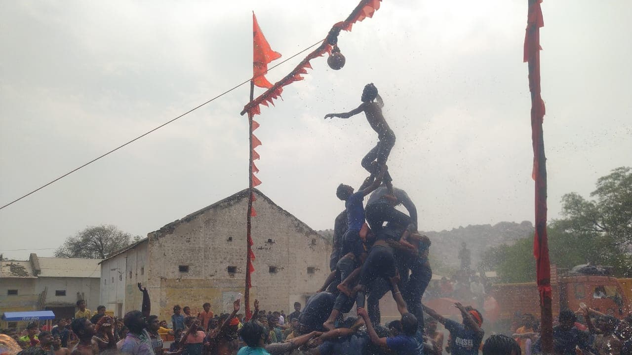 ಹೋಳಿ ಹಿನ್ನೆಲೆಯಲ್ಲಿ ಪಟ್ಟಣದ ಟಿಎಪಿಸಿಎಂಸಿ ಬಯಲು ಜಾಗದಲ್ಲಿ ವಿಶ್ವಹಿಂದೂ ಪರೀಷತ್ ಹಾಗೂ ಬಜರಂಗದಳವತಿಯಿಂದ ಹಮ್ಮಿಕೊಂಡಿದ್ದ ಬಣ್ಣದ ಮಡಕೆ ಹೊಡೆಯುವ ಸ್ಪರ್ಧೆಗೆ ರಂಗೇರಿತ್ತು.