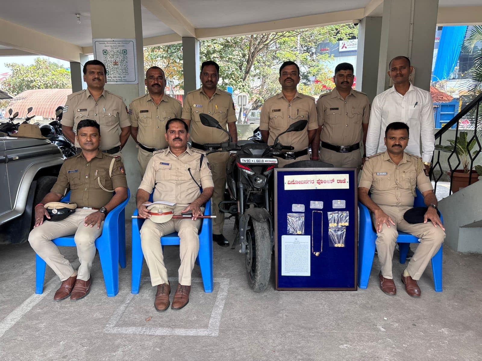 ಶಿವಮೊಗ್ಗ ವಿನೋಬನಗರ 16ನೇ ತಿರುವಿನಲ್ಲಿ 2025ರ ನ.18 ರಂದು ಬೈಕ್ನಲ್ಲಿ ಬಂದಿದ್ದ ಇಬ್ಬರು, ಪಾದಚಾರಿ ಹೊನ್ನಮ್ಮ ಅವರ ಬಂಗಾರದ ಮಾಂಗಲ್ಯ ಸರ ಕಿತ್ತು ಪರಾರಿಯಾಗಿದ್ದರು. ಈ ಬಗ್ಗೆ ವಿನೋಬನಗರ ಠಾಣೆಗೆ ದೂರು ನೀಡಿದ್ದರು. ಡಿವೈಎಸ್ಪಿ ಟಿ.ಸಂಜೀವ್ ಕುಮಾರ್ ಮಾರ್ಗದರ್ಶನದಲ್ಲಿ ವಿನೋಬನಗರ ಸಿಪಿಐ ಡಿ.ಕೆ.ಸಂತೋಷಕುಮಾರ್ ಉಸ್ತುವಾರಿಯಲ್ಲಿ ಪಿಎಸ್ಐ ಜಿ.ತಿರುಮಲೇಶ್ ಮತ್ತು ಸಿಬ್ಬಂದಿ ಕೆ.ಆರ್.ರಾಜು, ಬಿ.ಚಂದ್ರಾನಾಯ್ಕ, ಎಸ್.ಜಿ.ಮಲ್ಲಪ್ಪ, ಎನ್.ಕೆ.ಅರುಣ್ಕುಮಾರ್, ಮನುಶಂಕರ ಅವರನ್ನೊಳಗೊಂಡ ತಂಡ ಕಾರ್ಯಾಚರಣೆ ನಡೆಸಿ ಆರೋಪಿಗಳನ್ನು ಬಂಧಿಸಿದೆ.ವಿನೋಬನಗರ 16ನೇ ತಿರುವಿನಲ್ಲಿ ಮಾಂಗಲ್ಯಸರ ಕಳ್ಳತನ ಮಾಡಿದ್ದ ಪ್ರಕರಣದಲ್ಲಿ ವಲ್ಲರಸು ಮತ್ತು ಇಬ್ರಾಹಿಂ ಪಾಶಾನಿಂದ 4.80 ಲಕ್ಷ ರು. ಮೌಲ್ಯದ 40 ಗ್ರಾಂ ಬಂಗಾರದ ಗಟ್ಟಿ, 1.50 ಲಕ್ಷ ರು. ಮೌಲ್ಯದ ಬೈಕ್, ಕೇಶವನ್ ಕಡೆಯಿಂದ ಮೈಸೂರು ಪಿರಿಯಾಪಟ್ಟಣ ಠಾಣೆ ವ್ಯಾಪ್ತಿಯ ಪ್ರಕರಣದಲ್ಲಿ 8.50 ಲಕ್ಷ ರು. ಮೌಲ್ಯದ 70 ಗ್ರಾಂ ಮಾಂಗಲ್ಯ ಸರ ಹಾಗೂ ವಿನೋಬನಗರ ಠಾಣಾ ವ್ಯಾಪ್ತಿಯ ಪ್ರಕರಣದಲ್ಲಿ 10.20 ಲಕ್ಷ ರು. ಮೌಲ್ಯದ 60 ಗ್ರಾಂ ಬಂಗಾರದ ಆಭರಣ ಜಪ್ತಿ ಮಾಡಿದ್ದಾರೆ.