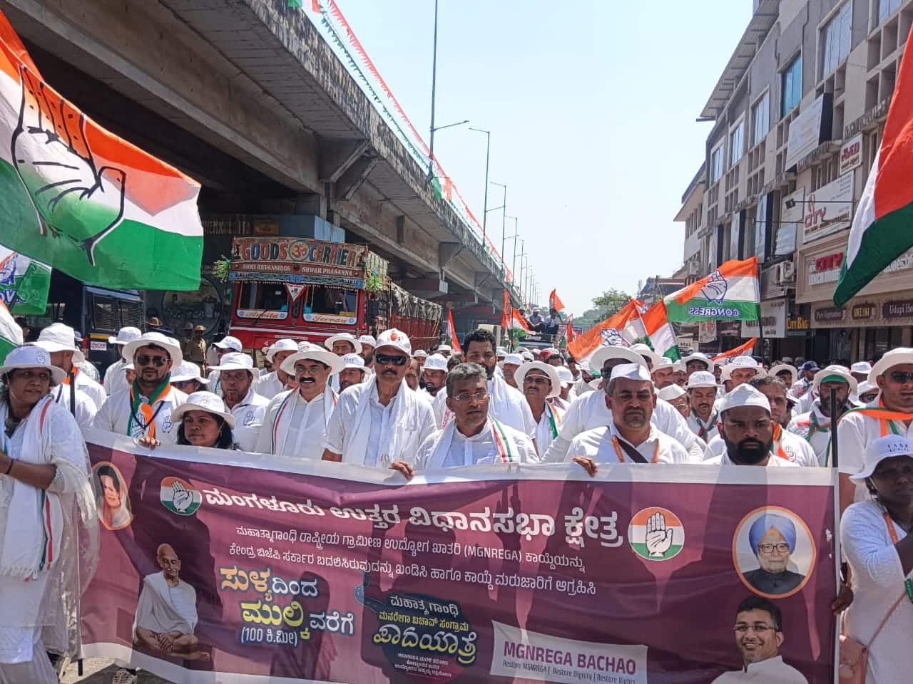ಮನ್ ರೇಗಾ ಉದ್ಯೋಗ ಖಾತ್ರಿ ಯೋಜನೆಯಲ್ಲಿ ಮಹಾತ್ಮ ಗಾಂಧೀಜಿಯವರ ಹೆಸರು ಕೈಬಿಟ್ಟಿರುವುದನ್ನು ಖಂಡಿಸಿ ಹಾಗೂ ಯೋಜನೆಯ ಹಳೆಯ ಸ್ವರೂಪದ ಮರುಸ್ಥಾಪನೆಗೆ ಆಗ್ರಹಿಸಿ ಜಿಲ್ಲಾ ಕಾಂಗ್ರೆಸ್ ಹಮ್ಮಿಕೊಂಡಿದ್ದ ಸುಳ್ಯದಿಂದ ಮೂಲ್ಕಿವರೆಗೆ ಹಮ್ಮಿಕೊಂಡ ನಾಲ್ಕು ದಿನಗಳ ಬೃಹತ್ ಪಾದಯಾತ್ರೆಯು ಕುಳೂರು ಬಳಿ ಬಂದಾಗ ಮಂಗಳೂರು ಉತ್ತರ ವಿಧಾನ ಸಭಾ ಕ್ಷೇತ್ರದಲ್ಲಿ ಕೆಪಿಸಿಸಿ ಪ್ರಧಾನ ಕಾರ್ಯದರ್ಶಿ ಇನಾಯತ್ ಅಲಿ ನೇತೃತ್ವದಲ್ಲಿ ಸ್ವಾಗತಿಸಿದ ಸಂದರ್ಭ ಅವರು ಮಾತನಾಡಿದರು. ಪಾದಯಾತ್ರೆಯುದ್ದಕ್ಕೂ ಸಾವಿರಾರು ಕಾರ್ಯಕರ್ತರು ಪಾಲ್ಗೊಳ್ಳುವ ಮೂಲಕ ಹೈಕಮಾಂಡ್ ಮುಂದೆ ಅಲಿ ಭರ್ಜರಿ ಶಕ್ತಿ ಪ್ರದರ್ಶನ ಮಾಡಿದರು. ಕೂಳೂರು ಗೋಲ್ಡ್ ಪಿಂಚ್ ಮೈದಾನದಿಂದ ಆರಂಭಗೊಂಡ ಮೆರವಣಿಗೆ ಸುರತ್ಕಲ್ವರೆಗೂ ಅತ್ಯಂತ ಅಬ್ಬರದಿಂದ ಸಾಗಿತು. ನೂರಾರು ಕಾರ್ಯಕರ್ತರು ಕೇಂದ್ರ ಸರ್ಕಾರದ ನೀತಿಗಳ ವಿರುದ್ಧ ಹಾಗೂ ಪ್ರಧಾನಿ ಮೋದಿ ವಿರುದ್ಧ ಘೋಷಣೆಗಳನ್ನು ಕೂಗುತ್ತಾ ಹೆಜ್ಜೆ ಹಾಕಿದರು. ಕಾಂಗ್ರೆಸ್ ಪಕ್ಷದ ಜಿಲ್ಲಾಧ್ಯಕ್ಷ ಹರೀಶ್ ಕುಮಾರ್, ಪಕ್ಷದ ನಾಯಕರು, ಮಂಗಳೂರು ಉತ್ತರ ವಿಧಾನ ಸಭಾ ಕ್ಷೇತ್ರದ ಪಕ್ಷದ ಧುರೀಣರು, ಕಾರ್ಯಕರ್ತರು ಪಾದಯಾತ್ರೆಯಲ್ಲಿ ಭಾಗವಹಿಸಿದ್ದರು. ಪಾವಂಜೆಯಲ್ಲಿ ಮೂಲ್ಕಿ ಬ್ಲಾಕ್ ಕಾಂಗ್ರೆಸ್ ಸಮಿತಿಯು ಮಾಜಿ ಸಚಿವ ಕೆ ಅಭಯಚಂದ್ರ ಜೈನ್ ನೇತ್ರತ್ವದಲ್ಲಿ ಪಾದಯಾತ್ರೆಯನ್ನು ಸ್ವಾಗತಿಸಿತು. ಸುರತ್ಕಲ್ನ ಕುಲಾಲ ಭವನದಲ್ಲಿ ಜಮಾವಣೆಗೊಂಡ ಕಾರ್ಯಕರ್ತರಿಗೆ ಭೋಜನದ ವ್ಯವಸ್ಥೆ ಮಾಡಲಾಗಿತ್ತು.ಮನ್ರೇಗಾ ಬದಲಾವಣೆಯಿಂದ ಬಡವರಿಗೆ ಅನ್ಯಾಯ: ಇನಾಯತ್ ಅಲಿ
