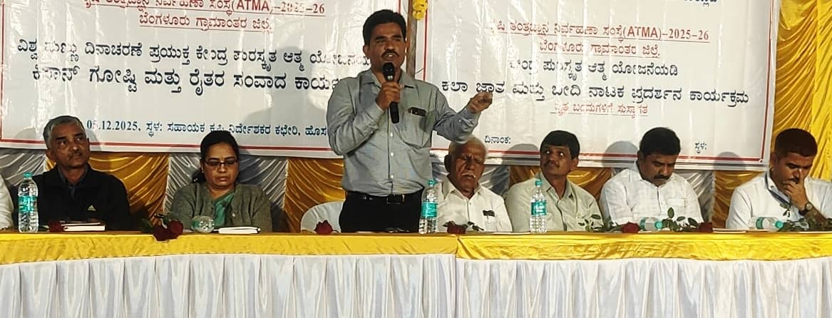 ಬೆಂಗಳೂರು ಗ್ರಾಮಾಂತರ ಜಿಲ್ಲಾ ಕೃಷಿ ಇಲಾಖೆ, ಸಹಾಯಕ ಕೃಷಿ ನಿರ್ದೇಶಕರ ಕಚೇರಿ ಹಾಗೂ ಹಾಡೋನಹಳ್ಳಿಯಲ್ಲಿರುವ ಜಿಲ್ಲಾ ಕೃಷಿ ವಿಜ್ಞಾನ ಕೇಂದ್ರದ ಸಹಯೋಗದಲ್ಲಿ ಆಯೋಜಿಸಿದ್ದ ವಿಶ್ವ ಮಣ್ಣು ದಿನ ಕಾರ್ಯಕ್ರಮಕ್ಕೆ ಚಾಲನೆ ನೀಡಿ ಮಾತನಾಡಿದರು.ಮಣ್ಣು ವಿಜ್ಞಾನಿ ಡಾ.ಪಿ.ವೀರನಾಗಪ್ಪ ಮಾತನಾಡಿ, 2025ರ ವಿಶ್ವ ಮಣ್ಣು ದಿನಾಚರಣೆಯ ಘೋಷವಾಕ್ಯ ಆರೋಗ್ಯಕರ ನಗರಗಳಿಗೆ ಆರೋಗ್ಯಕರ ಮಣ್ಣು ಎಂಬುದಾಗಿದ್ದು, ವಿಶ್ವ ಮಣ್ಣು ದಿನವನ್ನು ಪ್ರಪಂಚದಾದ್ಯಂತ ಡಿಸೆಂಬರ್ 5ರಂದು