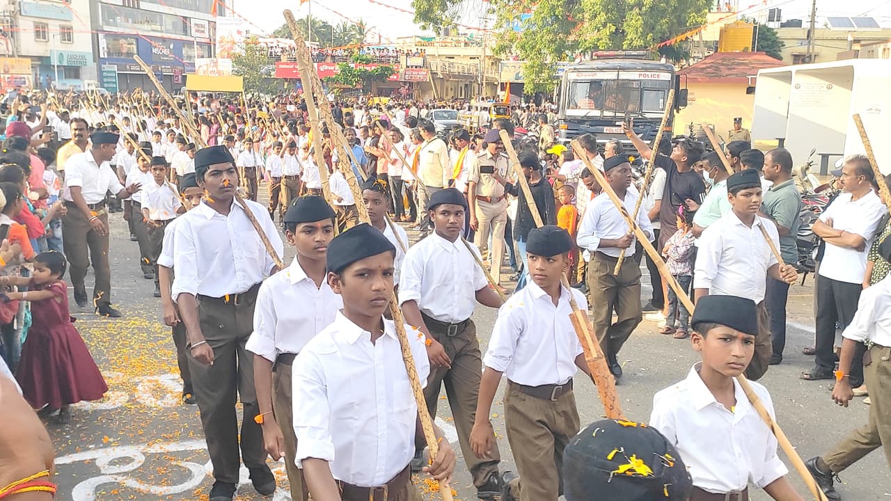 ವಿಜಯದಶಮಿ ಅಂಗವಾಗಿ ವಿದ್ಯಾಗಿರಿಯಲ್ಲಿ ಆರ್ಎಸ್ಎಸ್ನಿಂದ ಭಾನುವಾರ ಹಮ್ಮಿಕೊಂಡಿದ್ದ ಬಾಲಕರ ಪಥಸಂಚಲನದಲ್ಲಿ ಬಾಲಕರು ಕೈಯಲ್ಲಿ ಬೆತ್ತ ಹಿಡಿದುಕೊಂಡು ಆಕರ್ಷಕ ಹೆಜ್ಜೆ ಹಾಕಿದರು. ವಿದ್ಯಾಗಿರಿಯ ಅಥಣಿ ಕಲ್ಯಾಣ ಮಂಟಪದಲ್ಲಿ ಮಧ್ಯಾಹ್ನ ಆರಂಭವಾದ ಪಥ ಸಂಚಲನದಲ್ಲಿ ನೂರಾರು ಬಾಲಕರು ಪಾಲ್ಗೊಂಡಿದ್ದರು. ಇದನ್ನು ವೀಕ್ಷಿಸಲು ಸಾವಿರಾರು ಜನರು ಸೇರಿದ್ದರು. ಪಥ ಸಂಚಲನ ಆರಂಭವಾಗುತ್ತಿದ್ದಂತೆ ಪಟಾಕಿ ಸಿಡಿಸಿ ಸಂಭ್ರಮಿಸಿದರು.ಮಾರ್ಗದುದ್ದಕ್ಕೂ ಜನರು ರಸ್ತೆ, ಮನೆಗಳ ಮುಂದೆ ರಂಗೋಲಿ ಬಿಡಿಸಿದ್ದರು. ಸ್ವಾಗತ ಕಮಾನುಗಳನ್ನು ನಿಲ್ಲಿಸಿದ್ದರು. ಅಲ್ಲಲ್ಲಿ ಪುಠಾಣಿ ಮಕ್ಕಳು ದೇಶಭಕ್ತರು, ಮುಖಂಡರ ವೇಷಭೂಷಣ ಧರಿಸಿ ಸ್ವಾಗತಿಸಿದರು. ಅಥಣಿ ಕಲ್ಯಾಣ ಮಂಟಪದಿಂದ ಆರಂಭವಾದ ಪಥಸಂಚಲನ ವಿದ್ಯಾಗಿರಿಯ 7, 8 ಹಾಗೂ 9ನೇ ಕ್ರಾಸ್ನಲ್ಲಿ ಸಂಚರಿಸಿ 12ನೇ ಕ್ರಾಸ್, ಕಾಳಮ್ಮದೇವಿ, ಕೆಂಚಮ್ಮದೇವಿ ದೇವಸ್ಥಾನ, 15 ಹಾಗೂ 16ನೇ ಕ್ರಾಸ್, 18 ಹಾಗೂ19 ಕ್ರಾಸ್ನ ಅಡ್ಡ ರಸ್ತೆ ಮುಖಾಂತರ ನೇರವಾಗಿ 22ನೇ ಕ್ರಾಸ್ಗೆ ಆಗಮಿಸಿತು. ಇಂಜಿನಿಯರಿಂಗ್ ಕಾಲೇಜು ವೃತ್ತದ ಮೂಲಕ ಗೌರಿ ಶಂಕರ ಕಲ್ಯಾಣ ಮಂಟಪಕ್ಕೆ ತಲುಪಿತು. ಆಎಸ್ಎಸ್ನ ಹಿರಿಯರು, ಸಂಚಾಲಕರ ನೇತೃತ್ವದಲ್ಲಿ 500 ಕ್ಕೂ ಹೆಚ್ಚು ಬಾಲಕರು ಪಥ ಸಂಚಲದಲ್ಲಿ ಭಾಗವಹಿಸಿದ್ದರು. ಸಂಘದ ಘೋಷವಾದ್ಯದ ತಕ್ಕಂತೆ ಬಾಲಕರು ಹಾಕುತ್ತಿದ್ದ ಹೆಜ್ಜೆಗಳು ಆಕರ್ಷಿಸಿತು.