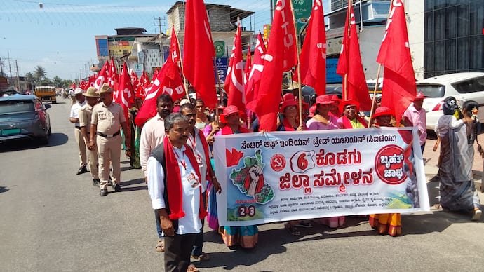 ಸಿಐಟಿಯು ಆರನೇ ಕೊಡಗು ಜಿಲ್ಲಾ ಸಮ್ಮೇಳನದ ಎರಡನೇ ದಿನ ಪ್ರತಿನಿಧಿಗಳು ಕುಶಾಲನಗರ ಪಟ್ಟಣದಲ್ಲಿ ಮೆರವಣಿಗೆ ನಡೆಸಿದರು.