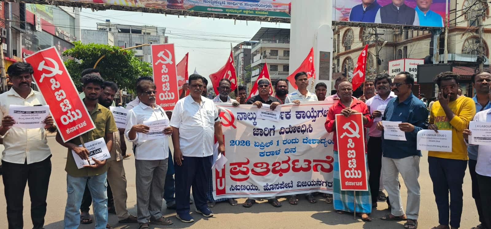 ಹೊಸಪೇಟೆ: ಏಪ್ರಿಲ್ 1 ರಿಂದ 4 ಕಾರ್ಮಿಕ ಸಂಹಿತೆಗಳಿಗೆ ಕೇಂದ್ರ ಸರ್ಕಾರ ನಿಯಮಗಳನ್ನು ಜಾರಿಗೆ ತರುತ್ತಿರುವುದನ್ನು ವಿರೋಧಿಸಿ ಇಲ್ಲಿನ ಸಿಐಟಿಯು ಸಂಘಟನೆಯ ಪದಾಧಿಕಾರಿಗಳು ಬುಧವಾರ ಕಾರ್ಮಿಕ ಕರಾಳ ದಿನಾಚರಣೆಯಾಗಿ ಪ್ರತಿಭಟನೆ ನಡೆಸಿದರು.ಪ್ರತಿಭಟನಾ ಸಭೆಯನ್ನು ಉದ್ದೇಶಿಸಿ ಸಿಐಟಿಯುನ ರಾಜ್ಯ ಉಪಾಧ್ಯಕ್ಷ ಬಸವರಾಜ್ ಮಾತನಾಡಿ, ನಾಲ್ಕು ಕಾರ್ಮಿಕ ಕಾಯಿದೆಗಳ ವಿರುದ್ಧ ಏಪ್ರಿಲ್ 1ರಿಂದ ಕರಾಳ ದಿನ ಆಚರಿಸಲು ಕೇಂದ್ರ ಕಾರ್ಮಿಕ ಸಂಘಟನೆಗಳು, ಅಖಿಲ ಭಾರತ ಪೆಢರೇಷನ್ಗಳ ಜಂಟಿ ವೇದಿಕೆಯು ಕರೆ ನೀಡಿದ್ದು, ಏಪ್ರಿಲ್ 1 ರಿಂದ ಕೇಂದ್ರ ಸರ್ಕಾರ 4 ಕಾರ್ಮಿಕ ಸಂಹಿತೆಗಳ ಅನುಷ್ಠಾನಕ್ಕಾಗಿ ಕೇಂದ್ರ ನಿಯಮಗಳನ್ನು ಜಾರಿಗೆ ತರುವುದಾಗಿ ಘೋಷಿಸಿದೆ. ವ್ಯವಹಾರವನ್ನು ಸುಲಭಿಕರಿಸಲು ಎಂಬ ಹೆಸರಿನಲ್ಲಿ ಕಾರ್ಮಿಕ ವಿರೋಧಿ ಮತ್ತು ಮಾಲೀಕರ ಪರವಾದ ಈ ಕಾರ್ಮಿಕ ಸಂಹಿತೆಗಳನ್ನು ಕಾರ್ಮಿಕ ಸಂಘಟನೆಗಳು ನಿರಂತರವಾಗಿ ವಿರೋಧಿಸುತ್ತಿವೆ ಮತ್ತು ಅವನ್ನು ರದ್ದುಪಡಿಸುವಂತೆ ಅವರು ಒತ್ತಾಯಿಸಿದರು.