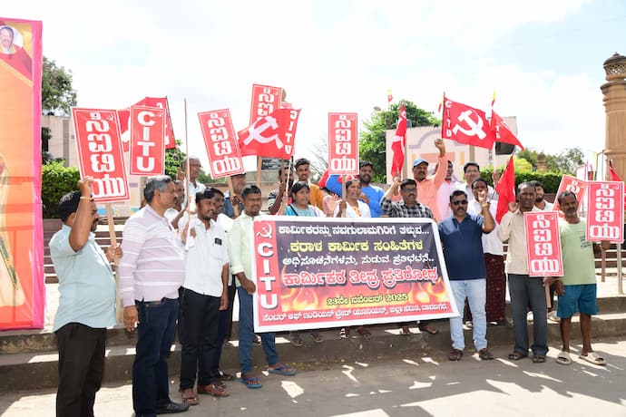 ದಾವಣಗೆರೆಯಲ್ಲಿ ಭಾನುವಾರ ಕೇಂದ್ರ ಸರ್ಕಾರದ ಕಾರ್ಮಿಕ ವಿರೋಧಿ ಕಾರ್ಮಿಕ ಸಂಹಿತೆಗಳನ್ನು ಕೈಬಿಡಲು ಒತ್ತಾಯಿಸಿ ಸಿಐಟಿಯು ಜಿಲ್ಲಾ ಘಟಕದಿಂದ ಪ್ರತಿಭಟಿಸಲಾಯಿತು.;Resize=(128,128))