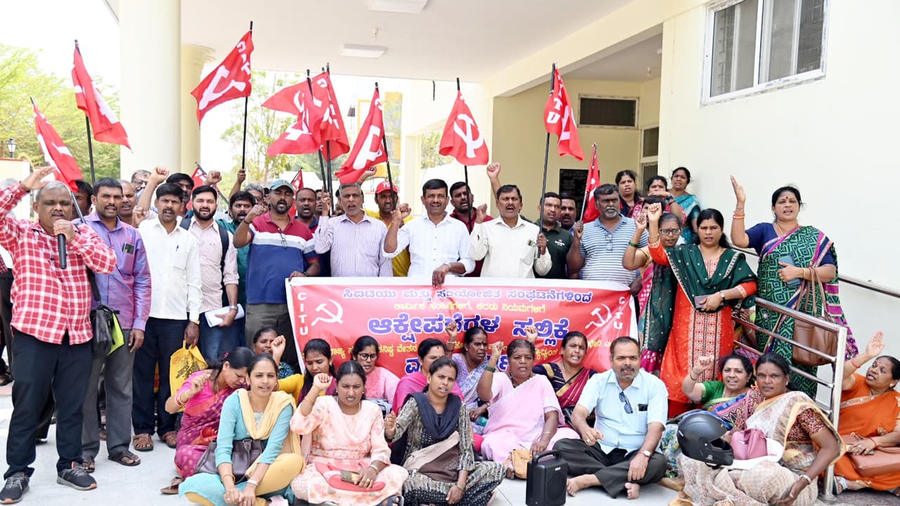 ಕೇಂದ್ರ ಸರ್ಕಾರದ ನಾಲ್ಕು ಕಾರ್ಮಿಕ ಸಂಹಿತೆಗಳನ್ನು ಹಿಂಪಡೆಯಲು ಆಗ್ರಹಿಸಿ ಸೆಂಟರ್ ಆಫ್ ಇಂಡಿಯನ್ ಟ್ರೇಡ್ ಯೂನಿಯನ್ (ಸಿಐಟಿಯು) ಜಿಲ್ಲಾ ಸಮಿತಿಯವರು ನಗರದ ಚಾಮುಂಡಿಬೆಟ್ಟದ ರಸ್ತೆಯಲ್ಲಿರುವ ಸಹಾಯಕ ಕಾರ್ಮಿಕ ಆಯುಕ್ತರ ಕಚೇರಿ ಮುಂಭಾಗದಲ್ಲಿ ಮಂಗಳವಾರ ಪ್ರತಿಭಟಿಸಿದರು.ದೇಶದ ಸಂವಿಧಾನ ಖಾತರಿಪಡಿಸಿರುವ ಒಕ್ಕೂಟ ಪದ್ಧತಿಯಲ್ಲಿ ರಾಜ್ಯ ಸರ್ಕಾರಕ್ಕಿರುವ ಅಧಿಕಾರ ನುಂಗುವ ಕೇಂದ್ರ ಸರ್ಕಾರ ನಡೆ ಖಂಡನಿಯ. ಕಾರ್ಮಿಕರ ಕುರಿತ ವಿಚಾರಗಳು ಸಮವರ್ತಿ ಪಟ್ಟಿಯಲ್ಲಿರುವುದರಿಂದ ರಾಜ್ಯದ ಕಾರ್ಮಿಕರನ್ನು ಗುಲಾಮಗಿರಿಗೆ ತಳ್ಳುವ ನಿಯಮಗಳನ್ನು ಬದಲಿಸಬೇಕು. 4 ಕಾರ್ಮಿಕ ಸಂಹಿತೆಗಳಲ್ಲಿ ಕಾರ್ಮಿಕರಿಗೆ ಮಾರಕವಾಗಿರುವ ಅಂಶಗಳನ್ನು ತಿದ್ದುಪಡಿ ಮೂಲಕ ಬದಲಿಸಬೇಕು. ಸಂಹಿತೆಗಳ ಜಾರಿಗೆ ಅಗತ್ಯ ನಿಯಮಾವಳಿ ರೂಪಿಸಬೇಕು ಎಂದು ಅವರು ಒತ್ತಾಯಿಸಿದರು.