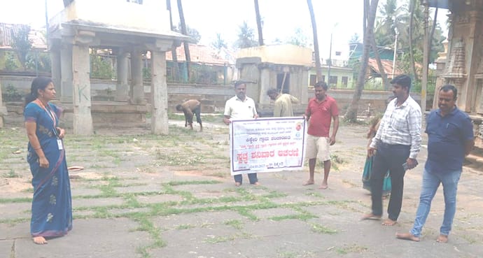 ಪೌರ ಕಾರ್ಮಿಕರು, ಅಧಿಕಾರಿಗಳು ಕೈಯಲಿ ಕುಡುಗೋಲು, ಹಾರೆ, ಪಿಕಾಸಿ, ಗುದ್ದಲಿ, ಪೊರಕೆ, ಬಾಂಡಲಿಗಳನ್ನು ಹಿಡಿದು ಕೂಲಿ ಕಾರ್ಮಿಕರಿಗೆ ತಾವು ಕಡಿಮೆ ಇಲ್ಲದಂತೆ ಕಲ್ಲು ಮುಳ್ಳು ಪೊದೆಗಳನ್ನು ಕಡಿದು ಒಂದೆಡೆ ಒಪ್ಪಊರಣ ಮಾಡಿದರು. ಕಲ್ಲು, ಮುಳ್ಳು ಬಾಚಿಗುಂಡಿ ಬಿದ್ದ ಸ್ಥಳವನ್ನು ಸಮತಟ್ಟು ಮಾಡಿದರು. ಕಲ್ಲು, ಮುಳ್ಳಿನ ಪೊದೆಗಳಿಂದ ತುಂಬಿದ ಪರಿಸರದ ಆವರಣವನ್ನು ಸುಂದರ ಗೊಳಿಸಿ ಕಲ್ಯಾಣಿಯಲ್ಲಿನ ನೀರಿನಿಂದ ತೊಳೆದು ಶುಚಿಗೊಳಿಸಿದರು.ದೇವಾಲಯದಲ್ಲಿದ್ದ ಜೇಡರ ಬಲೆ, ಧೂಳು ತೆಗೆದು ದೇಗುಲವನ್ನು ಸುಂದರಗೊಳಿಸಿದರು. ಈ ವೇಳೆ ಗ್ರಾಪಂ ಇಒ ಸಿ.ಚಲುವರಾಜು, ಕಾರ್ಯದರ್ಶಿ ಪಾಪೇಗೌಡ, ಲೆಕ್ಕ ಸಹಾಯಕ ವಾಸು, ಪೌರಕಾರ್ಮಿಕರುಇದ್ದರು.