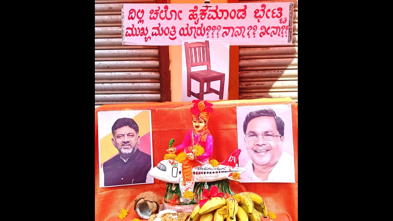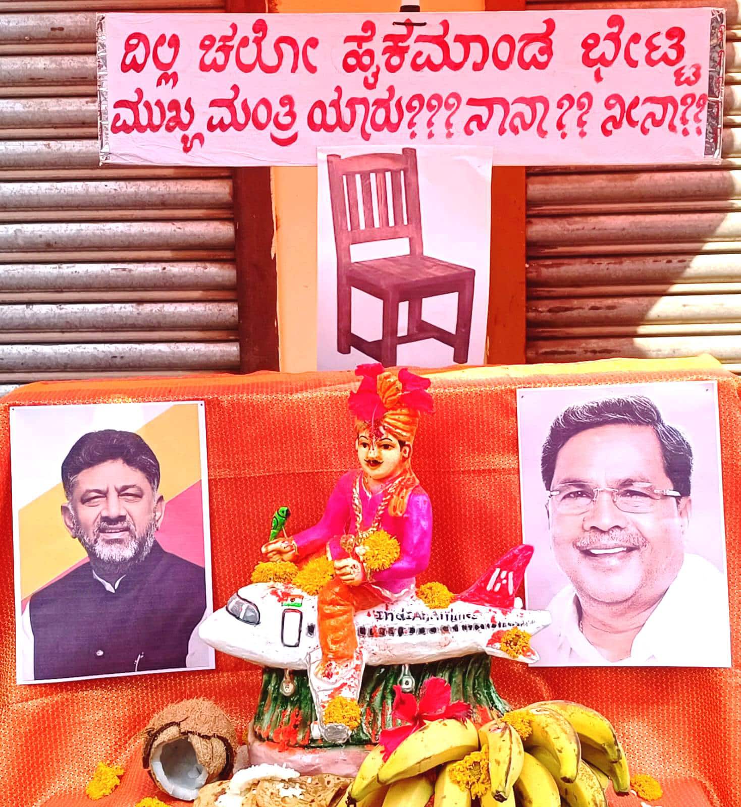 ರಬಕವಿ-ಬನಹಟ್ಟಿ: ಬನಹಟ್ಟಿಯ ಮಂಗಳವಾರ ಪೇಟೆಯ ವಿಠ್ಠಲ ದೇವಸ್ಥಾನ ಹತ್ತಿರ ಪ್ರತಿಷ್ಠಾಪಿಸಿದ ಕಾಮಣ್ಣ ಮೂರ್ತಿ ನೋಡುಗರ ಗಮನ ಸೆಳೆಯಿತು. ಮಂಗಳವಾರ ಹೋಳಿ ಹಬ್ಬದ ನಿಮಿತ್ತ ಕೂಡ್ರಿಸಲಾದ ಕಾಮಣ್ಣ ವಿಮಾನವೇರಿ ಕುಳಿತರೆ, ಒಂದೆಡೆ ಸಿಎಂ ಸಿದ್ದರಾಮಯ್ಯ ಮತ್ತೊಂದೆಡೆ ಡಿಸಿಎಂ ಡಿ.ಕೆ.ಶಿವಕುಮಾರ್ ಭಾವಚಿತ್ರ ಅಂಟಿಸಿ ದಿಲ್ಲಿ ಚಲೋ ಹೈಕಮಾಂಡ್ ಭೇಟಿ, ಮುಖ್ಯಮಂತ್ರಿ ನಾನಾ? ನೀನಾ? ಎಂದು ಬರೆದಿದ್ದು, ಮುಂದೆ ಖಾಲಿ ಕುರ್ಚಿ ಚಿತ್ರ ಪ್ರಸಕ್ತ ರಾಜಕೀಯ ಸನ್ನಿವೇಶವನ್ನು ಪ್ರತಿಬಿಂಬಿಸಿತು.