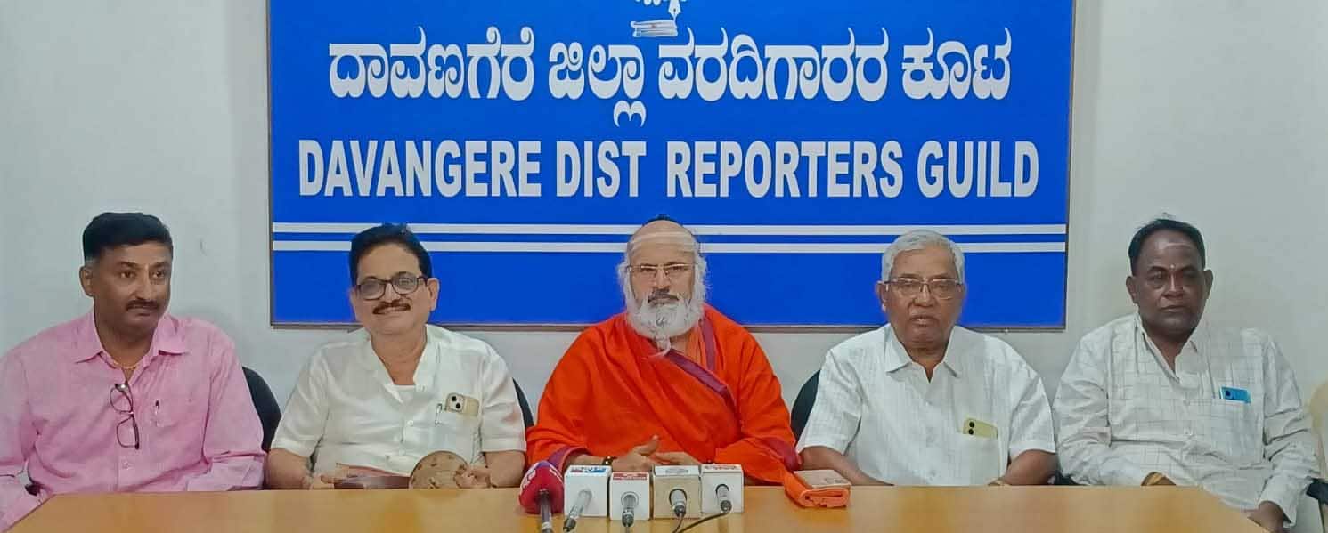 - - --20ಕೆಡಿವಿಜಿ5: ದಾವಣಗೆರೆಯಲ್ಲಿ ಭಾನುವಾರ ಆವರಗೊಳ್ಳ ಪುರವರ್ಗ ಮಠದ ಶ್ರೀ ಓಂಕಾರ ಶಿವಾಚಾರ್ಯ ಸ್ವಾಮೀಜಿ ಸುದ್ದಿಗೋಷ್ಟಿಯಲ್ಲಿ ಮಾತನಾಡಿದರು.