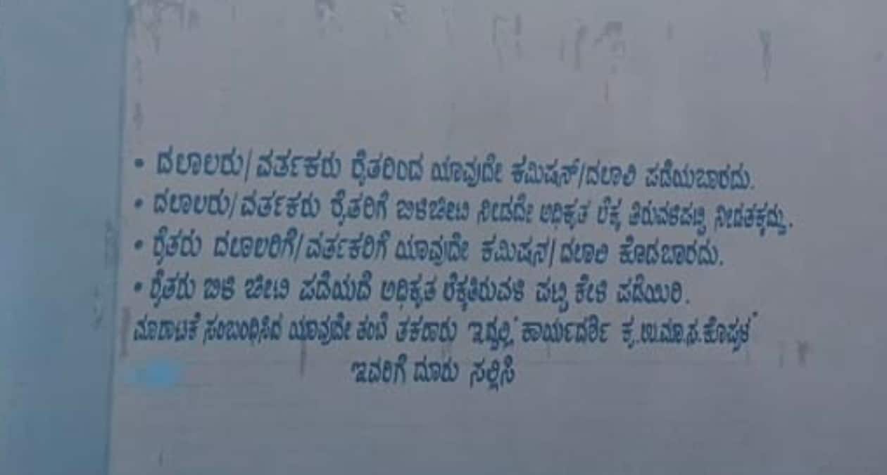 ಕೊಪ್ಪಳ: ರಾಜ್ಯ ಉಪಲೋಕಾಯುಕ್ತ ಬಿ. ವೀರಪ್ಪ ಅವರು ಆಗಮಿಸುವ ಮಾಹಿತಿ ಅರಿತು ಕೊಪ್ಪಳ ಎಪಿಎಂಸಿ ತರಕಾರಿ ಮಾರುಕಟ್ಟೆಯಲ್ಲಿ ಕಮಿಷನ್ ನೀಡುವಂತಿಲ್ಲ, ಪಡೆಯುವಂತೆ ಇಲ್ಲ ಎಂದು ಗೋಡೆಬರಹ ಬರೆಯಿಸಲಾಗಿದೆ. ಆದರೆ, ಅದೇ ಗೋಡೆಬರಹದ ಪಕ್ಕದಲ್ಲೇ ಬಿಳಿಚೀಟಿ ವ್ಯವಹಾರ ಹಾಗೂ ಕಮಿಷನ್ ದಂಧೆ ನಡೆಯುತ್ತಿದೆ.