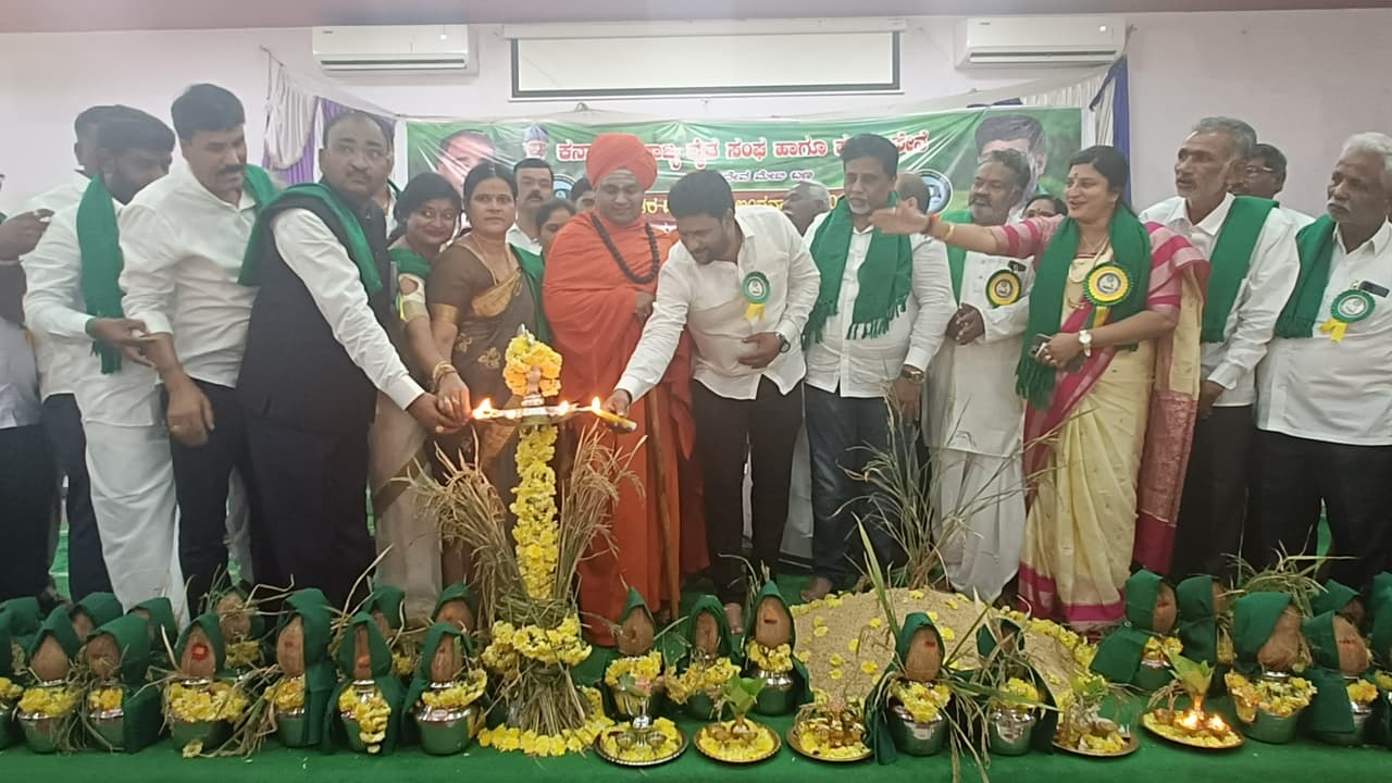 ಗರಗ ನಾಗಲಾಪುರ ಒಪ್ಪತ್ತೇಶ್ವರ ಮಠದ ಪ್ರಭುದೇಶೀಕ ಸ್ವಾಮೀಜಿ, ರೈತ ಸಂಘದ ಜಿಲ್ಲಾಧ್ಯಕ್ಷ ಸಿ.ಎ. ಗಾಳೆಪ್ಪ, ನಗರಸಭೆ ಸದಸ್ಯ ತಾರಿಹಳ್ಳಿ ಜಂಬುನಾಥ, ಮುಖಂಡರಾದ ಹೊನ್ನೂರವಲಿ, ವೆಂಕೋಬಣ್ಣ, ಸರಳಾ ಕಾವ್ಯ, ಪ್ರಕಾಶ ಮತ್ತಿತರರಿದ್ದರು. ಸಾಧಕ ರೈತರು, ಎಸ್ಸೆಸ್ಸೆಲ್ಸಿ, ಪಿಯುಸಿಯಲಿ ಅತಿ ಹೆಚ್ಚು ಅಂಕಗಳಿಸಿದ ರೈತರ ಮಕ್ಕಳನ್ನು ಸನ್ಮಾನಿಸಲಾಯಿತು.ಭವ್ಯ ಮೆರವಣಿಗೆ: ನಗರದ ವಡಕರಾಯ ದೇವಸ್ಥಾನದಿಂದ ರೈತರ ಭವ್ಯ ಮೆರವಣಿಗೆ ನಡೆಯಿತು. ಶಾಸಕ ಎಚ್.ಆರ್. ಗವಿಯಪ್ಪ ಚಾಲನೆ ನೀಡಿದರು. ಎಸ್ಪಿ ಶ್ರೀಹರಿಬಾಬು ಮತ್ತಿತರರಿದ್ದರು. ನಗರದ ವಿವಿಧ ಬೀದಿಗಳಲ್ಲಿ ಸಂಚರಿಸಿ ಒಳಾಂಗಣ ಕ್ರೀಡಾಂಗಣ ತಲುಪಿತು. ಪೂರ್ಣಕುಂಭ ಹೊತ್ತ ಮಹಿಳೆಯರು, ೧೧ ಜೋಡಿ ಎತ್ತಿನ ಬಂಡಿಗಳಲ್ಲಿ ರೈತರು ಮೆರವಣಿಗೆಯಲ್ಲಿ ಸಾಗಿ ಬಂದರು. ಜಾನಪದ ವಿವಿಧ ಕಲಾ ತಂಡಗಳು ಕೂಡ ಇದ್ದವು.