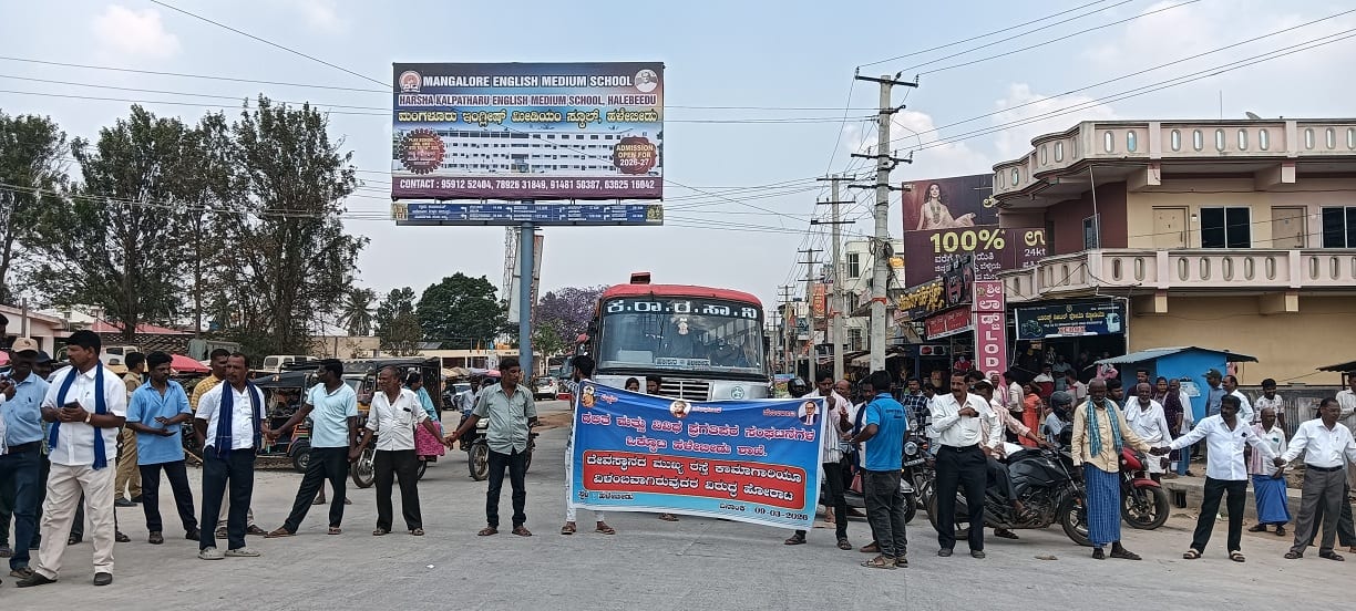 ವಿಶ್ವ ಪಾರಂಪರಿಕ ಪಟ್ಟಿಯಲ್ಲಿ ಸೇರಿದ ಇತಿಹಾಸದ ಹಳೇಬೀಡು(ದ್ವಾರಸಮುದ್ರ)ದ ಪ್ರಮುಖ ರಸ್ತೆಯಾದ ಶ್ರೀ ಹೊಯ್ಸಳೇಶ್ವರ ದೇವಾಲಯದ ಪ್ರಮುಖ ರಸ್ತೆಯ ಸಿಮೆಂಟ್ ಕಾಂಕ್ರೀಟ್ ಕೆಲಸ ಮೂರು ವರ್ಷಗಳಿಂದಲೂ ನಡೆಯುತ್ತಲೇ ಇದೆ ಎಂದು ಆರೋಪಿಸಿ ಪ್ರತಿಭಟನೆ ನಡೆಸಲಾಯಿತು.ಇದರ ಬಗ್ಗೆ ಹಲವಾರು ಅಧಿಕಾರಿಗಳಿಗೆ ಹಾಗೂ ಗುತಿಗ್ತೆದಾರಿಗೆ ಮನವಿಯನ್ನು ಸಲ್ಲಿಸಿ ಪತ್ರಿಕೆಯಲ್ಲಿ ಸುದ್ದಿಗಳು ಪ್ರಕಟವಾದರೂ ಸಹ ಈ ಕಾಮಗಾರಿಯ ಗುತ್ತಿಗೆದಾರ ಕೆಲಸದ ಬಗ್ಗೆ ತಲೆಯನ್ನು ಕೆಡಿಸಿಕೊಳ್ಳದೆ ಅರ್ಧಂಬರ್ಧ ಕೆಲಸವನ್ನು ಮಾಡಿ ಹಲವಾರು ಅಪಘಾತಗಳಿಗೆ ಅವಕಾಶ ಮಾಡಿಕೊಟ್ಟಂತ ಅಧಿಕಾರಿ ಮತ್ತು ಗುತ್ತಿಗೆದಾರ ಮೇಲೆ ಕ್ರಮ ಕೈಗೊಳ್ಳಬೇಕೆಂದು ಆಗ್ರಹಿಸಿ ಹಳೇಬೀಡಿನ ದಲಿತ ಮತ್ತು ವಿವಿಧ ಪ್ರಗತಿಪರ ಸಂಘಟನೆ ಒಕ್ಕೂಟ ಹಾಗೂ ಆಟೋ ಚಾಲಕ ಸಂಘ ಇನ್ನೂ ಹಲವಾರು ಸಂಘಗಳು ಸೋಮವಾರ ಪಟ್ಟಣದಲ್ಲಿ ಮಾನವ ಸರಪಳಿ ನಿರ್ಮಿಸಿ ಪ್ರತಿಭಟನೆ ನಡೆಸಿದರು.ಹಳೇಬೀಡಿಗೆ ನಿತ್ಯ ಪ್ರವಾಸಿಗರ ಸಂಖ್ಯೆ ದಿನೇ ದಿನೇ ಜಾಸ್ತಿ ಆಗುತ್ತಿದ್ದು ಈ ರಸ್ತೆಯಲ್ಲಿ ಪ್ರಮುಖವಾದ ರಸ್ತೆಯಲ್ಲಿ ಜಿಲ್ಲಿ, ಕಲ್ಲು ಹಾಕಿ ಬರುವ ವಾಹನಗಳಿಗೆ ಅಡಚಣೆ ಉಂಟು ಮಾಡಿ ಹಲವಾರು ಅಪಘಾತಕೆ ಆಹ್ವಾನ ಇದರ ಜೊತೆಗೆ ಧೇವಾಲಯದ ಸರ್ಕಲ್, ಆಸ್ಪತ್ರೆಗೆ ಗ್ರಾಮ ಪಂಚಾಯಿತಿ, ಪೊಲೀಸ್ ಠಾಣೆ ದಾರಿ ಹಾಗೂ ಕೆಎಸ್ಆರ್ಟಿಸಿ ಬಸ್ ಸ್ಟಾಂಡ್ಗೆ ಹೋಗುವ ದಾರಿಯ ಮಧ್ಯದಲ್ಲಿ ರಸ್ತೆಯನ್ನು ಕಟ್ಟು ಮಾಡಿ ಸುಮಾರು ೨ಅಡಿ ಆಳ ಗುಂಡಿ ಮಾಡಿ ಎರಡೂವರೆ ತಿಂಗಳ ಆದರೂ ಕೆಲಸವನ್ನು ಮಾಡದೆ ಗುತ್ತಿಗೆದಾರ ನಾಪತ್ತೆಯಾಗಿದ್ದು ಇಲ್ಲಿಯ ಜನತೆ ಬೇಸತ್ತು ಬಾಬಾ ಸಾಹೇಬ್ ಡಾ. ಅಂಬೇಡ್ಕರ್ ಸಂಘದ ಬೈರೇಶ, ಕುಮಾರ್, ನಿಂಗರಾಜು, ಕೃಷ್ಣ, ಹಾಗೂ ತೀರ್ಥೇಶ್, ಇನ್ನೂ ಹಲವಾರು ಮುಖಂಡತ್ವದಲ್ಲಿ ರಸ್ತೆಯನ್ನು ಬಂದು ಮಾಡಿದರು. ಪೊಲೀಸರ ಮಧ್ಯ ಪ್ರವೇಶ -ರಸ್ತೆಯ ಸುಗಮ ಸಂಚಾರಕ್ಕೆ ಅನುಕೂಲ ಮಾಡಿಕೊಡಲು ಪಿಎಸ್ಐ ಮಂಜುನಾಥ ಕೇಳಿಕೊಂಡರೂ ಪ್ರತಿಭಟನೆಗೆ ಕಾಮಗಾರಿ ಇಲಾಖೆ ಅಧಿಕಾರಿಗಳು, ಗುತ್ತಿಗೆದಾರರು ಹಾಗೂ ಜಿಲ್ಲಾಧಿಕಾರಿಗಳು ಶಾಸಕರು ಬರಲೇಬೇಕೆಂದು ಹಠ ಹಿಡಿದರು. ಸ್ಥಳಕ್ಕೆ ಇಲಾಖೆ ಅಧಿಕಾರಿ ಸೋಮಶೇಖರ್ ಆಗಮಿಸಿ ನಾಳೆಯಿಂದ ಕಾಮಗಾರಿನ ಪ್ರಾರಂಭ ಮಾಡುತ್ತೆವೆ ಎಂದು ಭರವಸೆ ನೀಡಿದರು. ಸ್ಥಳೀಯ ಮುಖಂಡರಾದ ಬೈರೇಶ್ ಮಾಧ್ಯಮದೊಂದಿಗೆ ಮಾತನಾಡುತ್ತ ಏಪ್ರಿಲ್ ತಿಂಗಳಲ್ಲಿ ನಮ್ಮ ಗ್ರಾಮದೇವತೆಯ ಕರಿಯಮ್ಮನ ಜಾತ್ರೆ ಬರಲಿದೆ ಆ ಜಾತ್ರೆಯ ಹೊತ್ತಿಗೆ ಕಾಮಗಾರಿ ಪೂರ್ಣಗೊಂಡು ಎರಡು ಬದಿಯ ರಸ್ತೆಯೂ ಸಂಚಾರಕ್ಕೆ ಸುಗಮವಾಗಬೇಕು, ಇಲ್ಲವಾದರೆ ಬೇಲೂರು ಮತ್ತು ಹಾಸನದಲ್ಲಿ ಇಲಾಖೆಗೆ ಮುತ್ತಿಗೆ ಹಾಕುತ್ತೇವೆ ಎಂದು ಎಚ್ಚರಿಕೆ ನೀಡಿದ್ದರು.ಹಳೇಬೀಡಿನ ಮುಖ್ಯ ರಸ್ತೆ ಕಾಮಗಾರಿ ವಿಳಂಬಕ್ಕೆ ಖಂಡನೆ