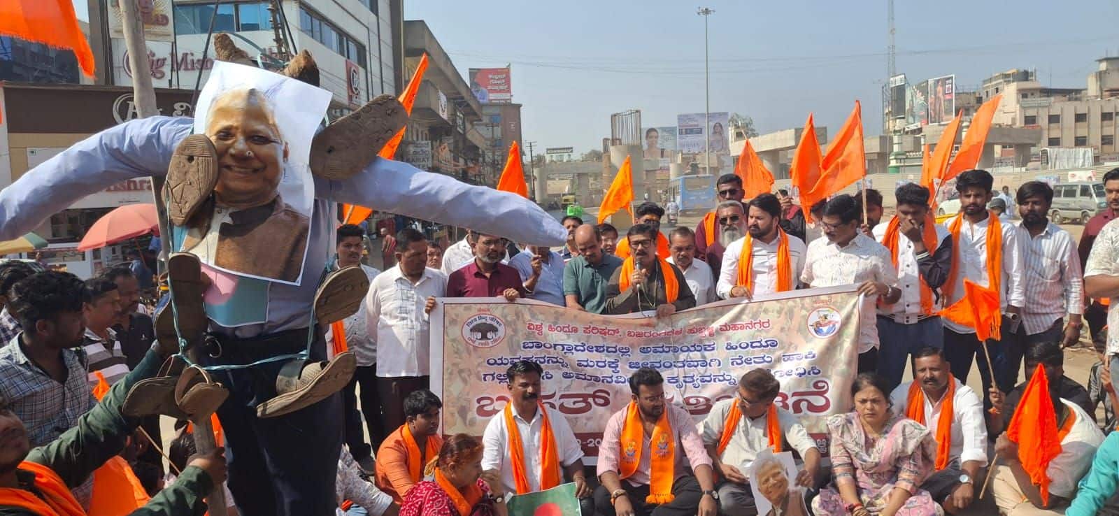 ಬಾಂಗ್ಲಾದೇಶದಲ್ಲಿ ನಡೆಯುತ್ತಿರುವ ಹಿಂದೂಗಳ ಹತ್ಯೆ ಖಂಡಿಸಿ ವಿಶ್ವಹಿಂದು ಪರಿಷತ್ ಭಜರಂಗದಳ ಕಾರ್ಯಕರ್ತರು ಬುಧವಾರ ಇಲ್ಲಿನ ಸಂಗೊಳ್ಳಿ ರಾಯಣ್ಣ ವೃತ್ತದಲ್ಲಿ ಬಾಂಗ್ಲಾ ಪ್ರಧಾನಿಯ ಪ್ರತಿಕೃತಿ ದಹಿಸಿ ಆಕ್ರೋಶ ವ್ಯಕ್ತಪಡಿಸಿದರು.ಬಾಂಗ್ಲಾದೇಶದಲ್ಲಿ ಹಿಂದೂಗಳ ಮೇಲೆ ಪದೇ ಪದೇ ಹತ್ಯೆ ನಡೆಯುತ್ತಿರುವುದು ಖಂಡನಾರ್ಹ. ಬಾಂಗ್ಲಾದ ಯುವ ನಾಯಕ ಷರೀಫ್ ಉಸ್ಮಾನ್ ಹತ್ಯೆಯ ನಂತರ ನಡೆದ ಗಲಭೆಯಲ್ಲಿ ದೀಪು ಚಂದ್ರಹಾಸ ಅವರನ್ನು ಅಲ್ಲಿಯ ಮತಿಯವಾದಿಗಳ ಗುಂಪು ಬೆಂಕಿ ಹಚ್ಚಿ ಹತ್ಯೆ ಮಾಡುವ ಮೂಲಕ ತಮ್ಮ ಕ್ರೂರತನ ಪ್ರದರ್ಶಿಸಿದ್ದಾರೆ. ಇದೊಂದು ಮಾನವೀಯತೆಯ ಕಗ್ಗೊಲೆಯಾಗಿದೆ. ಈ ಮೂಲಕ ಅಲ್ಪಸಂಖ್ಯಾತ ಹಿಂದೂಗಳಿಗೆ ರಕ್ಷಣೆ ಇಲ್ಲ ಎನ್ನುವುದು ಜಗಜ್ಜಾಹೀರವಾಗಿದೆ. ಇದೇ ರೀತಿ ಇನ್ನೂ ಹಲವು ಹಿಂದೂಗಳನ್ನು ಬಾಂಗ್ಲಾದೇಶದಲ್ಲಿ ಹತ್ಯೆ ಮಾಡುವ ಕೃತ್ಯ ನಡೆಯುತ್ತಿರುವುದು ಆತಂಕಕಾರಿ ಸಂಗತಿ ಎಂದು ಆಕ್ರೋಶ ವ್ಯಕ್ತಪಡಿಸಿದರು.