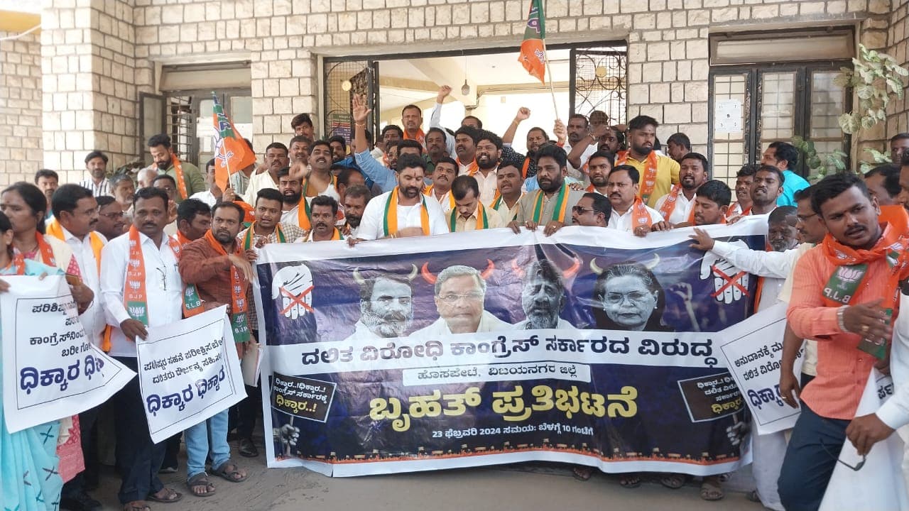 ಹೊಸಪೇಟೆ: ಪರಿಶಿಷ್ಟ ಜಾತಿ ಹಾಗೂ ಪರಿಶಿಷ್ಟ ವರ್ಗಗಳಿಗೆ ಮೀಸಲಿಟ್ಟಿರುವ ಅನುದಾನವನ್ನು 5 ಗ್ಯಾರಂಟಿ ಯೋಜನೆಗಳಿಗೆ ಬಳಕೆ ಮಾಡಿಕೊಂಡಿರುವುದನ್ನು ಖಂಡಿಸಿ ರಾಜ್ಯ ಸರ್ಕಾರದ ವಿರುದ್ಧ ಬಿಜೆಪಿ ಹೊಸಪೇಟೆಯಲ್ಲಿ ಬೃಹತ್ ಪ್ರತಿಭಟನೆ ನಡೆಸಿತು.