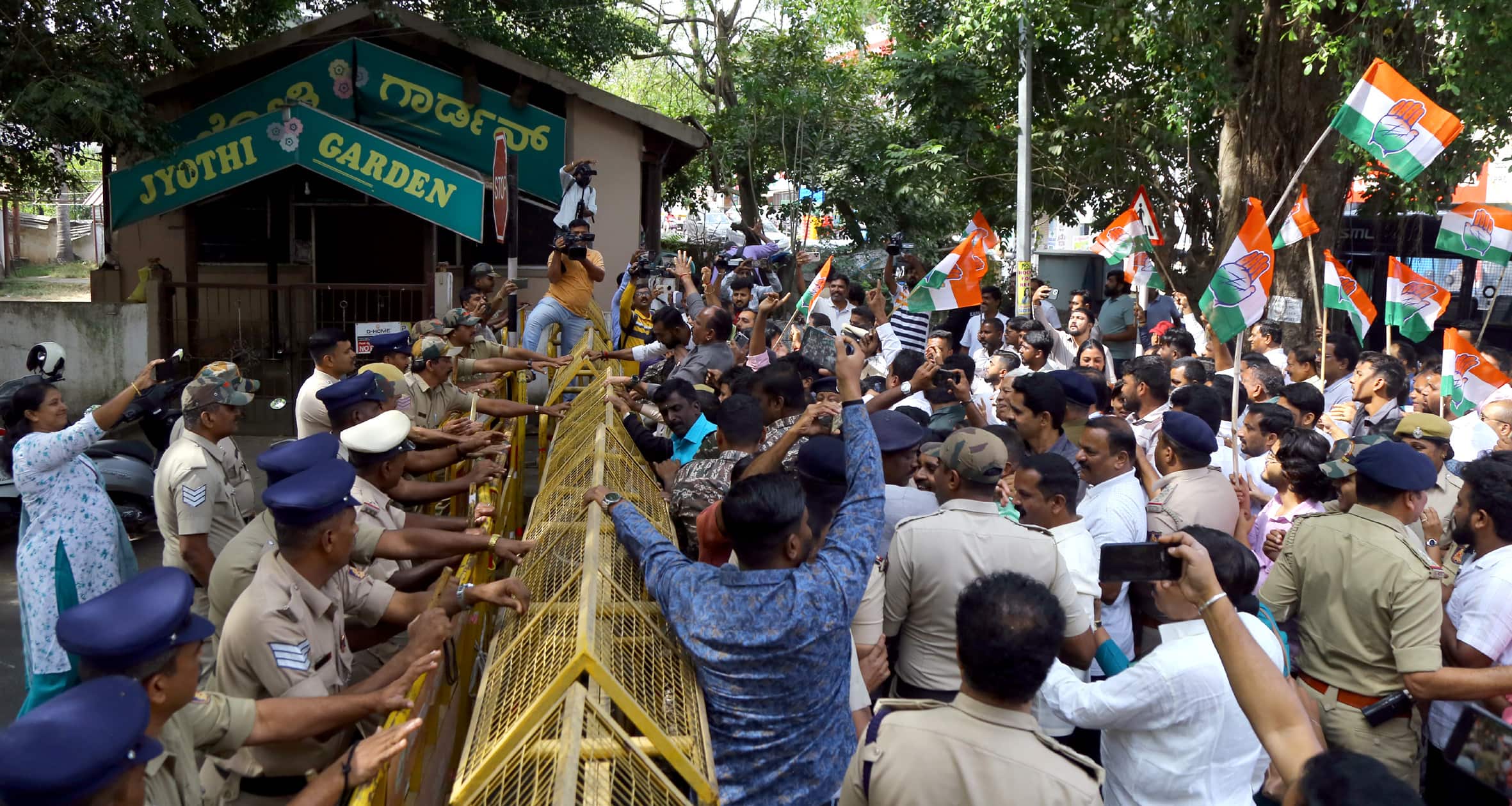 ನ್ಯಾಷನಲ್ ಹೆರಾಲ್ಡ್ ಪ್ರಕರಣದಲ್ಲಿ ಇಡಿ ಮೇಲೆ ಪ್ರಭಾವ ಬೀರಿ ಪಕ್ಷದ ರಾಷ್ಟ್ರೀಯ ನಾಯಕರ ಮೇಲೆ ಅನಗತ್ಯ ಆರೋಪ ಸೃಷ್ಟಿಸಿರುವುದು ಹಾಗೂ ಮನ್ರೇಗಾ ಹೆಸರು ಬದಲಾವಣೆಯನ್ನು ಖಂಡಿಸಿ ಗುರುವಾರ ಜಿಲ್ಲಾ ಬಿಜೆಪಿ ಕಚೇರಿಗೆ ಮುತ್ತಿಗೆ ಹಾಕಲು ಯತ್ನಿಸಿದ ಕಾಂಗ್ರೆಸ್ ಕಾರ್ಯಕರ್ತರನ್ನು ಪೊಲೀಸರು ವಶಕ್ಕೆ ಪಡೆದು ಬಳಿಕ ಬಿಡುಗಡೆ ಮಾಡಿದರು.
