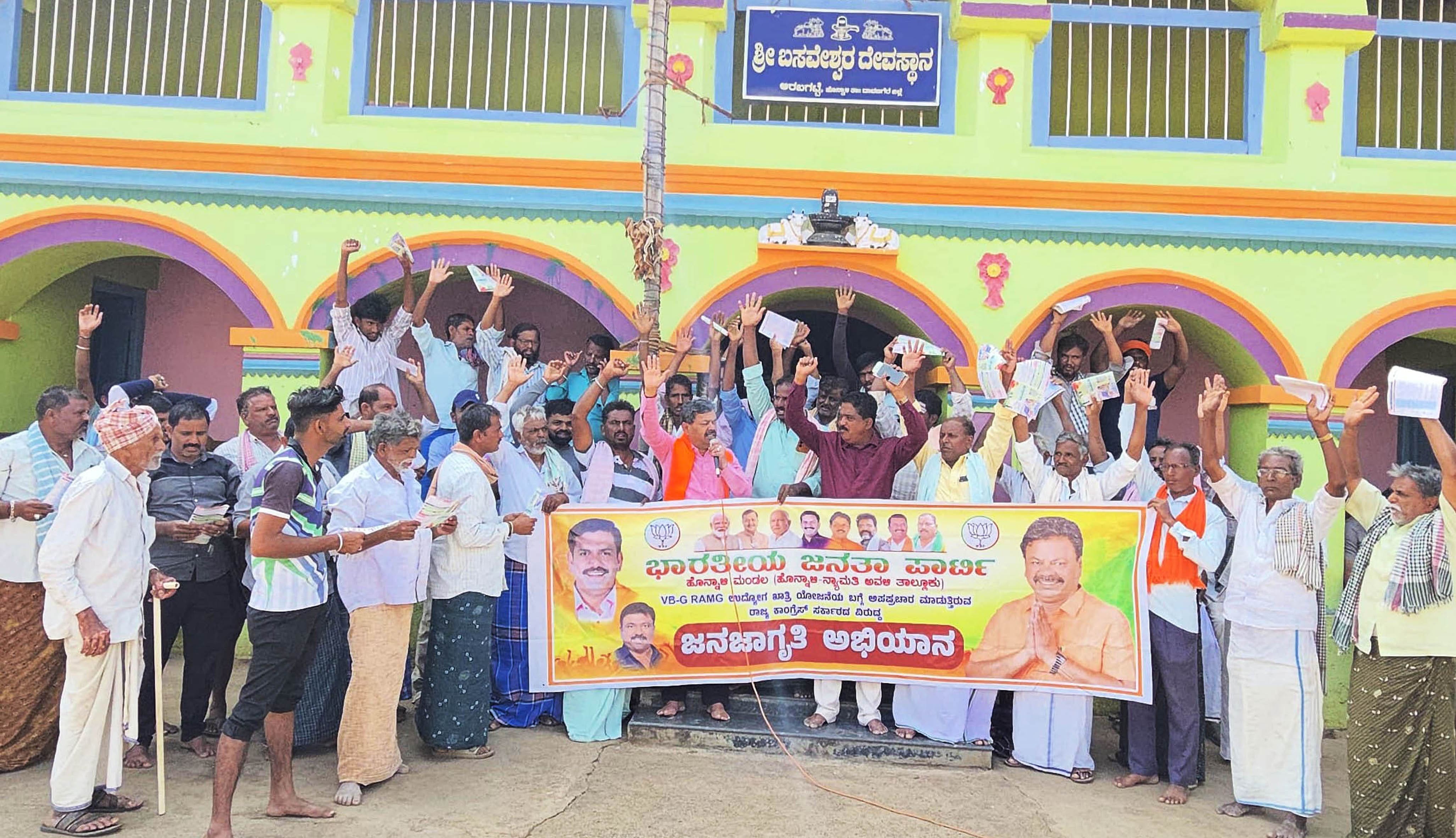 ಹೊನ್ನಾಳಿ ತಾಲೂಕಿನ ಹನುಮಸಾಗರ ಗ್ರಾ.ಪಂ. ವ್ಯಾಪ್ತಿಯ ಕೋನಾಯಕನಹಳ್ಳಿ, ಬಳ್ಳೇಶ್ವರ ಹಾಗೂ ಹನುಮಸಾಗರ ಗ್ರಾಮಗಳಲ್ಲಿ ವಿಬಿ- ಜಿ ರಾಮ್ ಜಿ ಕಾಯ್ದೆ ಬಗ್ಗೆ ಜಾಗೃತಿ ಮೂಡಿಸಲು ಹೊನ್ನಾಳಿಯಿಂದ ಫೆ. 17ರಂದು ಪಕ್ಷದ ಮುಖಂಡರ ಜೊತೆ ಪಾದಯಾತ್ರೆ ಹಮ್ಮಿಕೊಳ್ಳಲಾಗಿದೆ ಎಂದು ರೇಣುಕಾಚಾರ್ಯ ಈ ಸಂದರ್ಭ ತಿಳಿಸಿದರು.ತಾಲೂಕು ಬಿಜೆಪಿ ಮಾಜಿ ಅಧ್ಯಕ್ಷ ಜೆ.ಕೆ.ಸುರೇಶ್, ಮುಖಂಡರಾದ ಕರಿಬಸಪ್ಪ ಇತರರು ಇದ್ದರು.