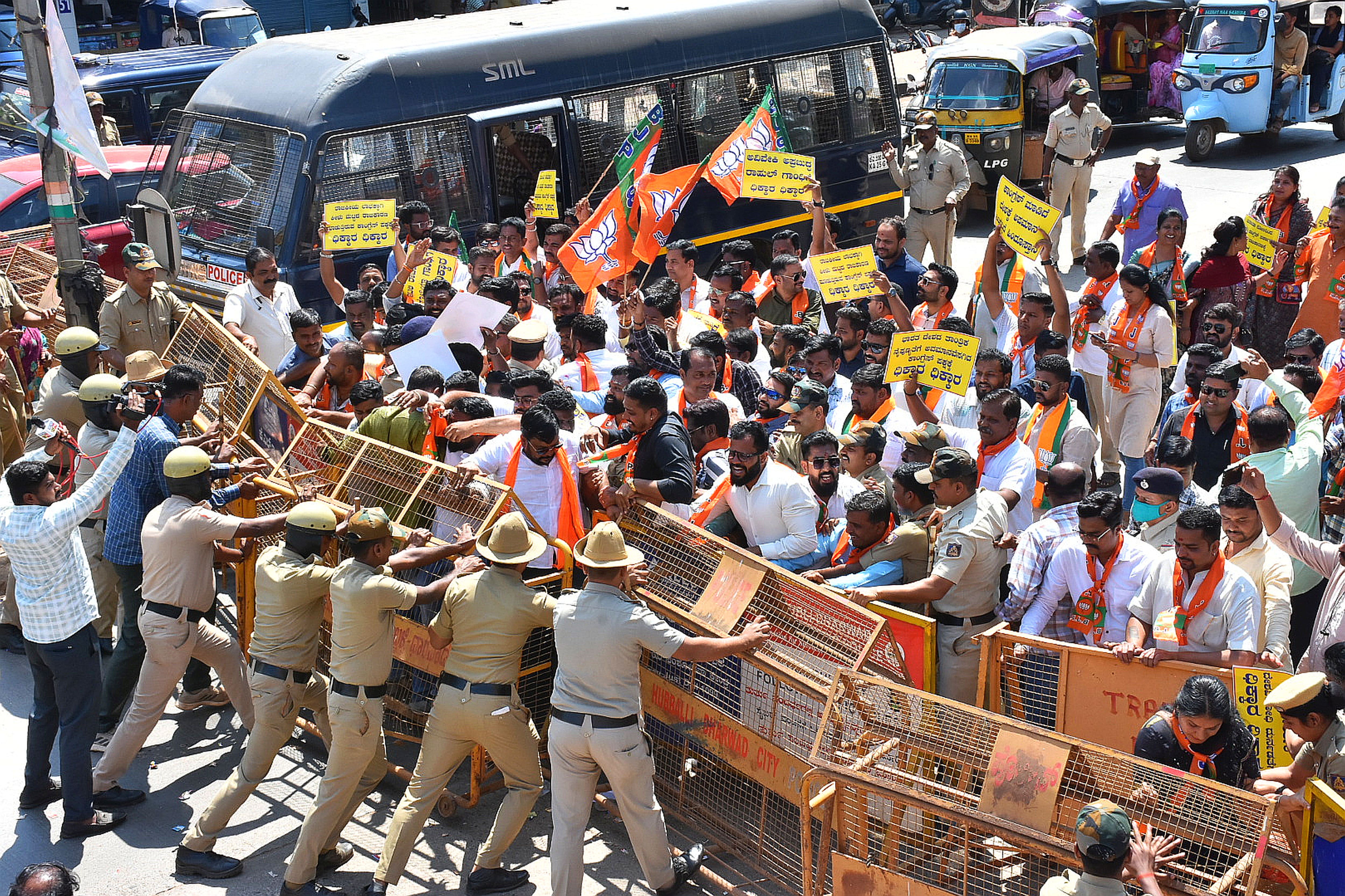 ಶೃಂಗಸಭೆ ನಡೆಯುತ್ತಿರುವಾಗ ಏಕಾಏಕಿ ಮೋದಿ ಹಾಗೂ ಡೊನಾಲ್ಡ್ ಟ್ರಂಪ್ ಚಿತ್ರಗಳಿರುವ ಟಿಶರ್ಟ್ ಹಿಡಿದುಕೊಂಡು ಪ್ರತಿಭಟನೆ ಆರಂಭಿಸಿದ್ದ ಕಾಂಗ್ರೆಸ್ ಕಾರ್ಯಕರ್ತರು, ಭಾರತ- ಅಮೆರಿಕ ನಡುವಿನ ಒಪ್ಪಂದದಲ್ಲಿ ಮೋದಿ ರಾಜಿ ಮಾಡಿಕೊಂಡಿದ್ದಾರೆ ಎಂದು ಪ್ರತಿಭಟನೆ ನಡೆಸಿದ್ದರು. ಅಲ್ಲದೇ, ಸಮಿಟ್ಗೆ ಬಂದಿದ್ದ ವಿಶ್ವ ಗಣ್ಯರ ಮುಂದೆ ಭಾರತಕ್ಕೆ ಅಪಮಾನವಾಗಿದೆ ಎಂದು ಆರೋಪಿಸಿದ್ದರಲ್ಲದೆ, `ಅಮೆರಿಕದ ಜತೆ ಟ್ರೇಡ್ ಡೀಲ್ ಎಂದು ಘೋಷಣೆ ಕೂಗಿದ್ದರು.ಕಾಂಗ್ರೆಸ್ನ ಈ ನಡೆಯನ್ನು ಖಂಡಿಸಿ ಆ ಪಕ್ಷದ ಕಚೇರಿಯೆದುರು ಬಿಜೆಪಿ ಯುವ ಮೋರ್ಚಾ ಕಾರ್ಯಕರ್ತರು ಪ್ರತಿಭಟನೆ ನಡೆಸಿದರು. ಪೂರ್ಣ ಪ್ರಮಾಣದಲ್ಲಿ ಸತ್ಯಾಸತ್ಯತೆಯನ್ನು ಅರಿಯದೇ ವಿಶ್ವದ ವಿವಿಧ ದೇಶಗಳಿಂದ ಆಗಮಿಸಿದ್ದ ಅತಿಥಿಗಳ ಎದುರು ಪ್ರಧಾನಿ ನರೇಂದ್ರ ಮೋದಿ ಅವರನ್ನು ಅಪಮಾನ ಮಾಡಲಾಗಿದೆ ಎಂದು ಆರೋಪಿಸಿದರು.ಕಾರವಾರ ರಸ್ತೆಯಲ್ಲಿರುವ ಕಾಂಗ್ರೆಸ್ ಕಚೇರಿಗೆ ನೂರಾರು ಸಂಖ್ಯೆಯಲ್ಲಿ ಬಿಜೆಪಿ ಕಾರ್ಯಕರ್ತರು ಮುತ್ತಿಗೆ ಹಾಕಲು ಯತ್ನಿಸಿದರು. ಪೊಲೀಸರು ಸಾಕಷ್ಟು ಸಮಾಧಾನ ಪಡಿಸಿದರೂ ಜಗ್ಗದ ಬಿಜೆಪಿ ಕಾರ್ಯಕರ್ತರು, ಬ್ಯಾರಿಕೇಡ್ಗಳನ್ನು ತಳ್ಳಾಡಿ ಮುತ್ತಿಗೆ ಹಾಕಲು ಯತ್ನಿಸಿದರು. ಈ ವೇಳೆ ಪೊಲೀಸರು ಹಾಗೂ ಬಿಜೆಪಿ ಕಾರ್ಯಕರ್ತರ ನಡುವೆ ಚಕಮಕಿ ನಡೆಯಿತು. ಪೊಲೀಸರು ಹಲವರನ್ನು ಬಂಧಿಸಿ, ಅಲ್ಲಿಂದ ಕರೆದುಕೊಂಡು ಹೋದರು. ಈ ಮೂಲಕ ಕಾಂಗ್ರೆಸ್ ಕಚೇರಿ ಮುತ್ತಿಗೆ ಹಾಕುವ ಯತ್ನವನ್ನು ವಿಫಲಗೊಳಿಸಿದರು.