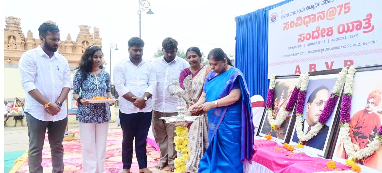 ಇಂತಹ ಸಂವಿಧಾನ ದುಷ್ಟರ ಕೈಗೆ ಸಿಗಬಾರದು, ಒಳ್ಳೆಯ ಆಡಳಿತದಿಂದ ಇದು ಅನುಷ್ಠಾನಗೊಳ್ಳಬೇಕು , ಸಂವಿಧಾನ ಇನ್ನು ಹೆಚ್ಚು ಅರಿವು ಮೂಡಬೇಕು ಎಂಬ ಉದ್ದೇಶದಿಂದ ಅಖಿಲ ಭಾರತೀಯ ವಿದ್ಯಾರ್ಥಿ ಪರಿಷತ್, ಕರ್ನಾಟಕ ದಕ್ಷಿಣ ಪ್ರಾಂತ್ಯದ ವತಿಯಿಂದ ಚಾಮರಾಜನಗರದಿಂದ ಮೈಸೂರಿನವರೆಗೆ ಸಂವಿಧಾನ ಸಂದೇಶ ಪಾದಯಾತ್ರೆ ಹಮ್ಮಿಕೊಂಡಿದೆ, ಇದು ಯಶಸ್ವಿಯಾಗಲಿ ಎಂದರು.ಸಮಾರಂವನ್ನು ಮಾಜಿ ಸಚಿವ ಹಾಗೂ ಮಾಜಿ ಸಂಸದ ದಿ. ವಿ, ಶ್ರೀನಿವಾಸಪ್ರಸಾದ್ ಅವರ ಧರ್ಮಪತ್ನಿ ಭಾಗ್ಯಲಕ್ಷ್ಮಿ ಶ್ರೀನಿವಾಸಪ್ರಸಾದ್ ಉದ್ಘಾಟಿಸಿ, ಯಾತ್ರೆಗೆ ಶುಭ ಹಾರೈಸಿದರು.
