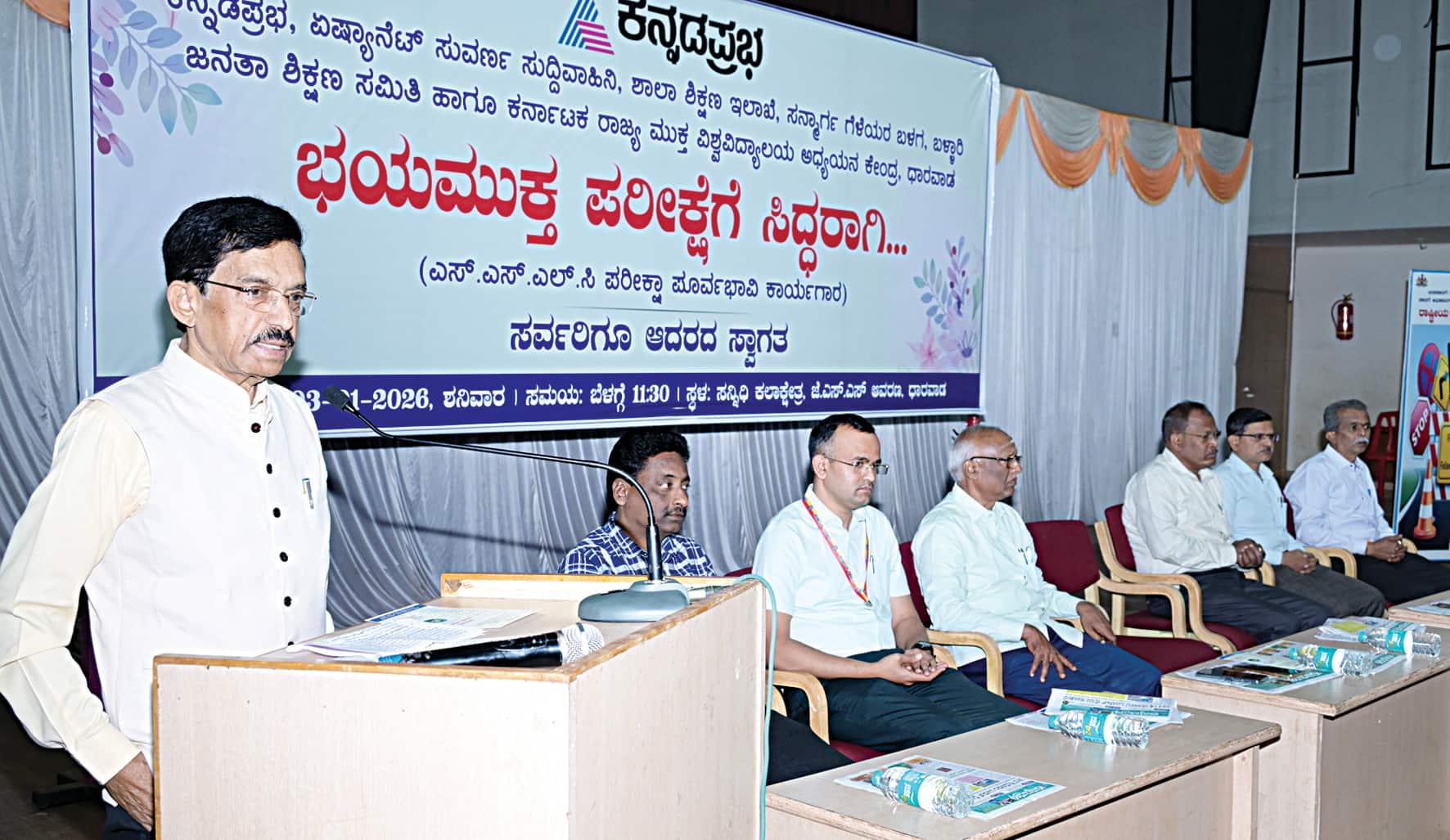 ಪ್ರಾಸ್ತಾವಿಕ ಮಾತನಾಡಿದ ಕನ್ನಡಪ್ರಭ ಬ್ಯೂರೋ ಮುಖ್ಯಸ್ಥ ಮಲ್ಲಿಕಾರ್ಜುನ ಸಿದ್ದಣ್ಣವರ, ಎಸ್ಸೆಸ್ಸೆಲ್ಸಿ ಫಲಿತಾಂಶದ ವೇಳೆ ಎಲ್ಲ ಮಾಧ್ಯಮಗಳಲ್ಲಿ ರಾಜ್ಯಕ್ಕೆ ರ್ಯಾಂಕ್ ಪಡೆದ ವಿದ್ಯಾರ್ಥಿಗಳ ಹೆಸರು, ಜಿಲ್ಲೆಗಳ ಸ್ಥಾನಮಾನ, ಸಾಧಿಸಿದ ಶಾಲೆಗಳ ಕುರಿತು ಫೋಟೋ ಸಮೇತ ಮುಖಪುಟದಲ್ಲಿ ಸುದ್ದಿ ಪ್ರಕಟವಾಗುತ್ತವೆ. ಫಲಿತಾಂಶದ ಕುಸಿತಕ್ಕೆ ಶಿಕ್ಷಣ ಇಲಾಖೆ, ಶಿಕ್ಷಕರು, ಪಾಲಕರು ಕಾರಣವೆಂದು ಆರೋಪಿಸುವುದು ಸಹಜ ಹಾಗೂ ಸರಳ. ಆದರೆ, ಸುಧಾರಣೆ ತರುವ ಹೊಣೆಗಾರಿಕೆ ಬರೀ ಶಿಕ್ಷಣ ಇಲಾಖೆ ಮೇಲಷ್ಟೇ ಅಲ್ಲದೆ ಮಾಧ್ಯಮಗಳ ಮೇಲೂ ಇದೆ. ಹೀಗಾಗಿ ಕನ್ನಡಪ್ರಭ, ಏಷ್ಯಾನೆಟ್ ಸುವರ್ಣ ನ್ಯೂಸ್ ವಿದ್ಯಾರ್ಥಿಗಳಲ್ಲಿ ಪರೀಕ್ಷಾ ಭಯ ಹೋಗಲಾಡಿಸಲು ಮತ್ತು ಶಿಸ್ತು ಓದು ರೂಢಿಸಿಕೊಳ್ಳಲು ಕಾರ್ಯಾಗಾರ ಆಯೋಜಿಸುತ್ತಿದೆ ಎಂದರು.ಆತ್ಮಸ್ಥೈರ್ಯದಿಂದ ಅಧ್ಯಯನ ಮಾಡಿ ಭಯ ಮುಕ್ತರಾಗಿ ಪರೀಕ್ಷೆ ಎದುರಿಸಿದರೆ ಉತ್ತಮ ಅಂಕಗಳು ತಾನಾಗಿಯೇ ಬರುತ್ತವೆ. ಈ ಮೂಲಕ ಶಿಕ್ಷಕರು, ಪಾಲಕರಿಗೆ ಕೀರ್ತಿ ತನ್ನಿ ಎಂದು ಮಕ್ಕಳಿಗೆ ಸಲಹೆ ನೀಡಿದರು.