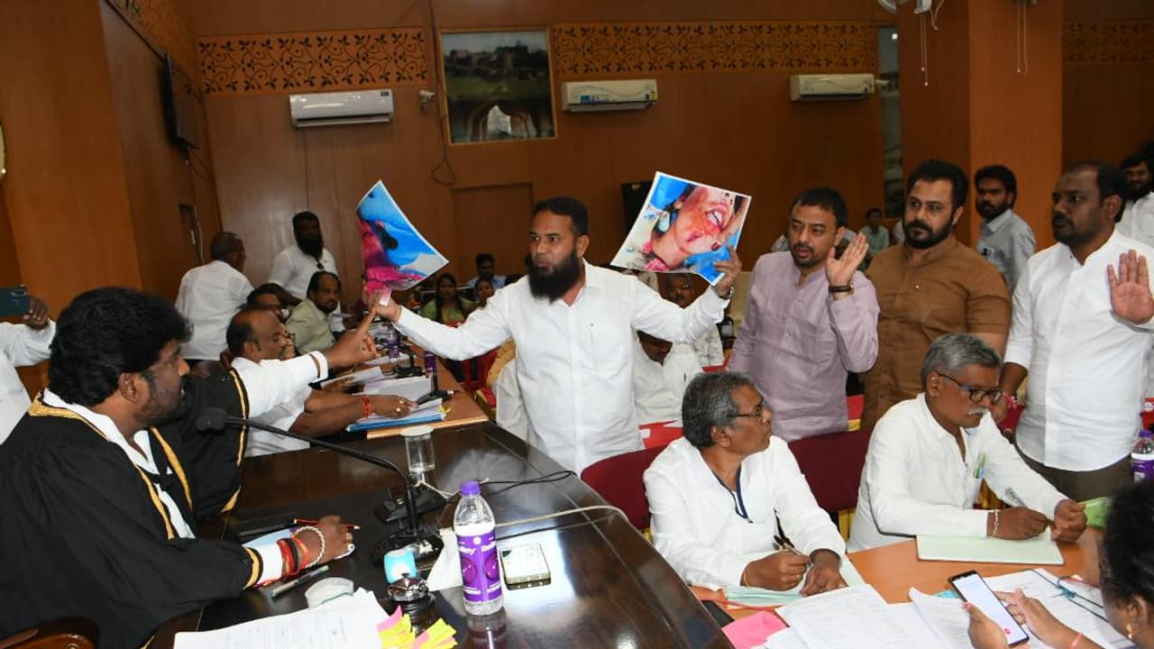 ಹಲವು ತಿಂಗಳ ನಂತರ ಪಾಲಿಕೆಯ ಸಾಮಾನ್ಯ ಸಭೆ ನಡೆದಿತ್ತಾದರೂ ಸದಸ್ಯರು ಅನೇಕರು ಬಾಗಿಲಲ್ಲೇ ಧರಣಿ ಕುಳಿತುಕೊಂಡು ನಾಯಿ ಕಡಿತಕ್ಕೆ ಪರಿಹಾರ ನೀಡಬೇಕು, ಶ್ವಾನ ಸಮಸ್ಯೆಗೆ ಪರಿಹಾರ ಕಲ್ಪಿಸಬೇಕೆಂದು ಪಟ್ಟು ಹಿಡಿದರಲ್ಲದೆ ಈ ವಿಷಯವಾಗಿ ಸೂಕ್ತ ನಿರ್ಣಯ ಅಂಗೀಕರಿಸೋವರೆಗೂ ಸಭೆ ನಡೆಸಲು ಬಿಡೋದಿಲ್ಲವದಾಗೆಂ ಟೌನ್ ಹಾಲ್ ಮುಂದೆ ವಾತಾವರಣ ಕೆಲಕಾಲ ಗೊಂದಲಮಯಾಗಿ ಕಾಡಿತ್ತು.ನಗರದಲ್ಲಿ ನಾಯಿಕಾಟ ಸಾಕಷ್ಟಿದ್ದರು ಪಾಲಿಕೆ ಕಾಲಹರಣ ಮಾಡುತ್ತಿದೆ, ಸಮಸ್ಯೆ ಕಡೆಗಣಿಸಿದ್ದರಿಂದಲೇ ಮಿಸ್ಬಾ ನಗರದಲ್ಲಿ ಮತ್ತೆ ನಾಯಿ ಕಡಿತ ಸಂಭವಿಸಿದೆ ಎಂದು ಪ್ರತಿಭಟನಾ ನಿರತರು ದೂರಿದರು. ಏತನ್ಮಧ್ಯೆ ಮೇಯರ್ ವಿಶಾಲ ಧರ್ಗಿ, ಆಯುಕ್ತ ಭುವನೇಶ ಪಾಟೀಲ್, ಶಾಸಕ ಅಲ್ಲಂಪ್ರಭು ಪಾಟೀಲರು ಸಭೆಗೆ ಅವಕಾಶ ಕೊಡಿ, ಚಚ್ರಿಸೋಣವೆಂದರೂ ಕೇಳದ ಪುರಪಿತೃಗಳು ಪರಿಹಾರ ಇಲ್ಲೇ ಘೋಷಿಸಿ ಒಳಗೆ ಹೋಗುವಂತೆ ಪಟ್ಟು ಹಿಡಿದರು. ಈ ಹಂತದಲ್ಲಿ ಶಾಸಕ ಅಲ್ಲಂಪ್ರಭು ಪಾಟೀಲರು ಜಿಲ್ಲಾ ಉಸ್ತುವಾರಿ ಸಚಿವ ಪ್ರಿಯಾಂಕ್ ಖರ್ಗೆಯವರಿಗೆ ದೂರವಾಣಿ ಕರೆ ಮಾಡಿ ಸಂಪರ್ಕಿಸಿ ವಿಷಯ ವಿವರಿಸಿದರಲ್ಲದೆ ಸದಸ್ಯರಿಗೆ ಸದರಿ ವಿಚಾರ ಹೇಳುತ್ತ ಸಮಸ್ಯೆಗೆ ಪರಿಹಾರ ಹುಡುಕುವ ವಿಚಾರದಲ್ಲಿ ಸಚಿವರೂ ಆಸಕ್ತರಿದ್ದಾರೆ. ಸಭೆ ನಡೆಸಿ ಪರಿಹಾರ ಹುಡುಕೋಣವೆಂದು ಮನವಿ ಮಾಡಿದಾಗ ಪುರಪಿತೃಗಳು ಪ್ರತಿಭಟನೆ ಕೈಬಿಟ್ಟರು.
