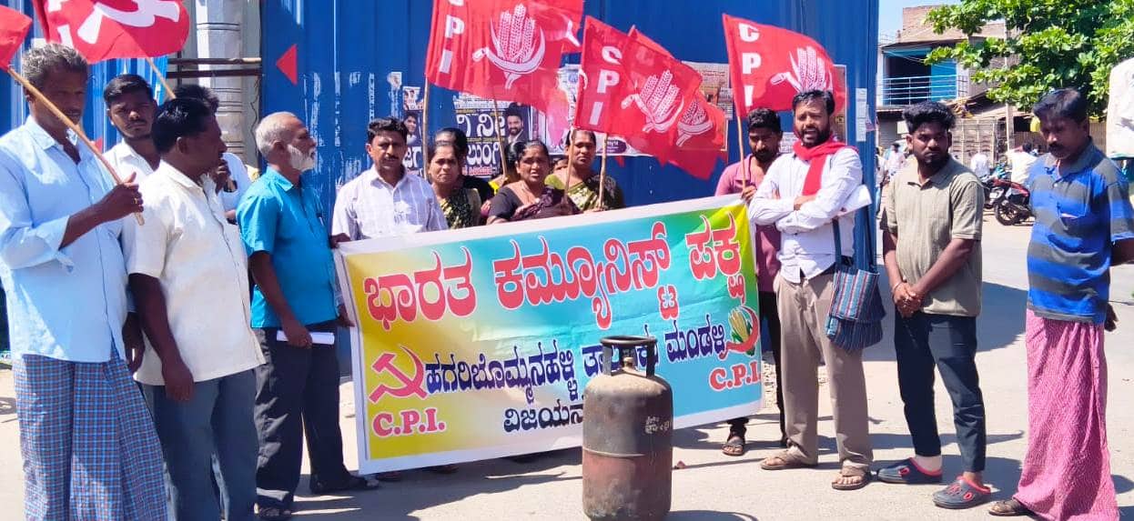 ಪ್ರತಿಭಟನೆಯಲ್ಲಿ ಸಿಪಿಐ ತಾಲೂಕು ಕಾರ್ಯದರ್ಶಿ ಬಿ.ದಾದಾವಲಿ, ಮುಖಂಡರಾದ ಕೆ.ಮುದಿಯಪ್ಪ, ಲಲಿತಾ, ಕೊಟ್ರೇಶ್, ಗಾಳೆಮ್ಮ, ನಾಗರಾಜ್, ಗಣೇಶ್, ಶಿವಕುಮಾರ್, ವಿಜಯಲಕ್ಷ್ಮೀ ಪಾಲ್ಗೊಂಡಿದ್ದರು.ಹಗರಿಬೊಮ್ಮನಹಳ್ಳಿಯಲ್ಲಿ ಅಡುಗೆ ಅನಿಲ ಬೆಲೆ ಏರಿಕೆ ಖಂಡಿಸಿ ಸಿಪಿಐ ಪಕ್ಷದ ಪದಾಧಿಕಾರಿಗಳು, ಕಾರ್ಯಕರ್ತರು ಬಸವೇಶ್ವರ ವೃತ್ತದಲ್ಲಿ ಪ್ರತಿಭಟನೆ ನಡೆಸಿದರು.