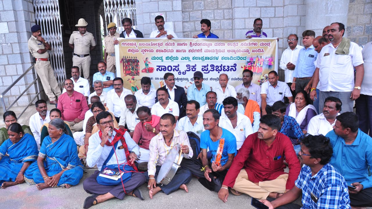 ಗಗನಚುಕ್ಕಿ ಜಲಪಾತೋತ್ಸವ ಹಾಗೂ ಶ್ರೀರಂಗಪಟ್ಟಣ ದಸರಾ ಮಹೋತ್ಸವದಲ್ಲಿ ಸ್ಥಳೀಯ ಕಲಾವಿದರನ್ನು ಕಡೆಗಣಿಸಿರುವುದನ್ನು ಖಂಡಿಸಿ ಕಲಾವಿದರು ಸೋಮವಾರ ಜಿಲ್ಲಾಧಿಕಾರಿ ಕಚೇರಿ ಎದುರು ಪ್ರತಿಭಟನೆ ನಡೆಸಿದರು.ನಗರದ ಸರ್ ಎಂ.ವಿಶ್ವೇಶ್ವರಯ್ಯ ಪ್ರತಿಮೆ ಬಳಿಯಿಂದ ಮೆರವಣಿಗೆ ಹೊರಟ ವಿವಿಧ ಕಲಾ ಪ್ರಕಾರಗಳ ಕಲಾವಿದರು ಜಿಲ್ಲಾಧಿಕಾರಿ ಕಚೇರಿಗೆ ತೆರಳಿ ಮನವಿ ಸಲ್ಲಿಸಿದರು.