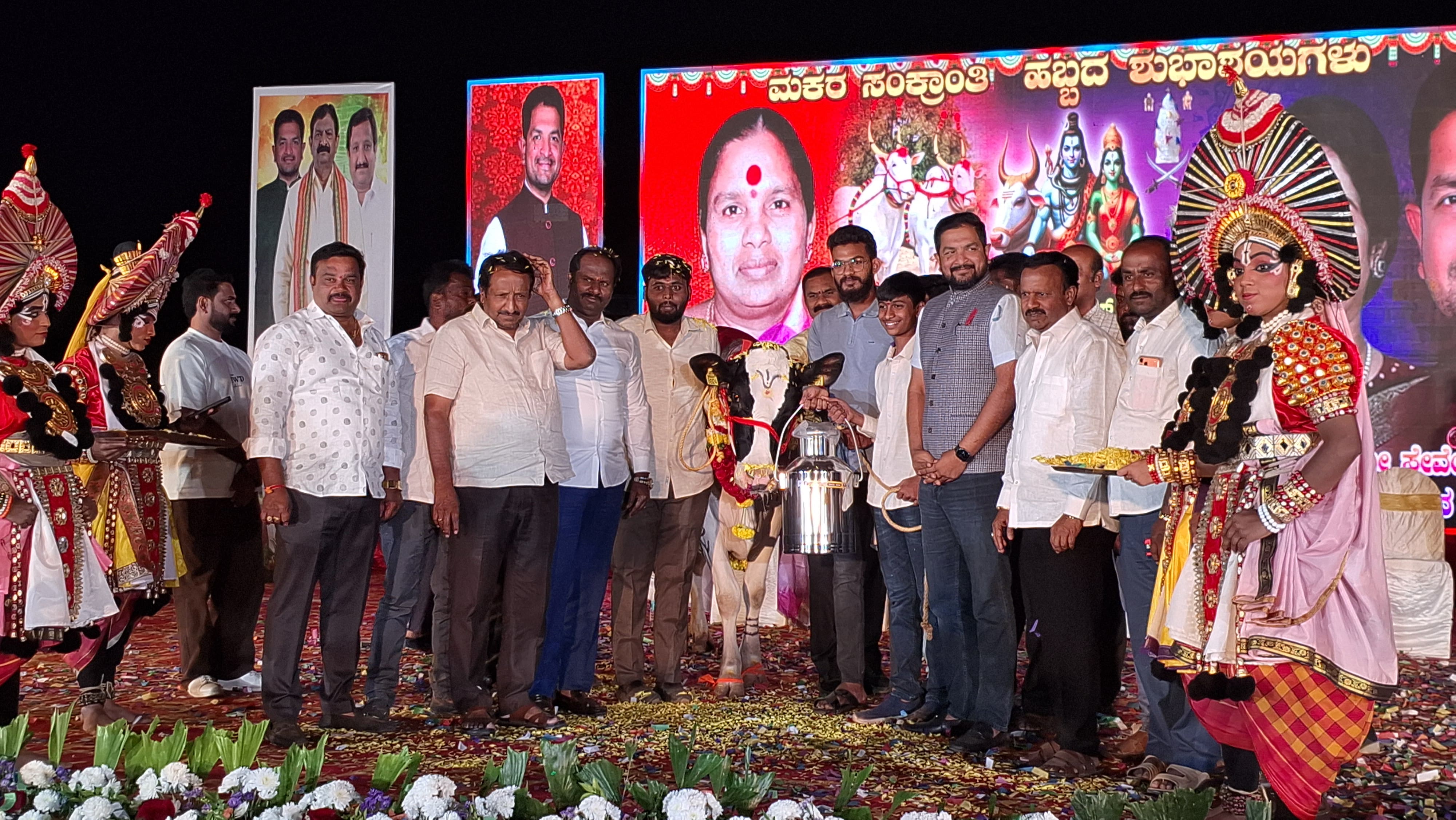 2: ಹೊಸಕೋಟೆಯ ಚನ್ನಭೈರೇಗೌಡ ಜಿಲ್ಲಾ ಕ್ರೀಡಾಂಗಣದಲ್ಲಿ ಜನನಿ ಚಾರಿಟಬಲ್ ಟ್ರಸ್ಟ್ ಹಮ್ಮಿಕೊಂಡಿದ್ದ ಸಂಕ್ರಾಂತಿ ಹಬ್ಬದ ಕಾರ್ಯಕ್ರಮದಲ್ಲಿ ಉತ್ತಮ ರಾಸುಗಳಿಗೆ ಶಾಸಕ ಶರತ್ ಬಚ್ಚೇಗೌಡ ಬಹುಮಾನ ವಿತರಿಸಿದರು.3: ಹೊಸಕೋಟೆಯ ಚನ್ನಭೈರೇಗೌಡ ಜಿಲ್ಲಾ ಕ್ರೀಡಾಂಗಣದಲ್ಲಿ ಆಯೋಜಿಸಿದ್ದ ಡಾ.ಸಿ.ಜಯರಾಜ್ ಅವರ ಸಂಕ್ರಾಂತಿ ಹಬ್ಬದ ಕಾರ್ಯಕ್ರಮದಲ್ಲಿ ರಾಸುಗಳಿಗೆ ಬೂಸಾ ಮೂಟೆಗಳನ್ನು ಶಾಸಕ ಶರತ್ ಬಚ್ಚೇಗೌಡ ವಿತರಿಸಿದರು.