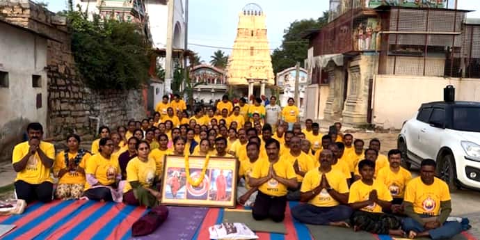 ೩೦ ದೇವನಹಳ್ಳಿ ಚಿತ್ರಸುದ್ದಿ: ೨ದೇವನಹಳ್ಳಿಯಲ್ಲಿ ಸಾಮೂಹಿಕ ಯೋಗ ದುರ್ಗಾ ನಮಸ್ಕಾರ ಹಾಗೂ ದುರ್ಗಾ ಮಂತ್ರ ಪಠಣೆಗೆ ಅಧ್ಯಕ್ಷ ಮುನಿವೆಂಕಟಪ್ಪ ಚಾಲನೆ ನೀಡಿದರು.