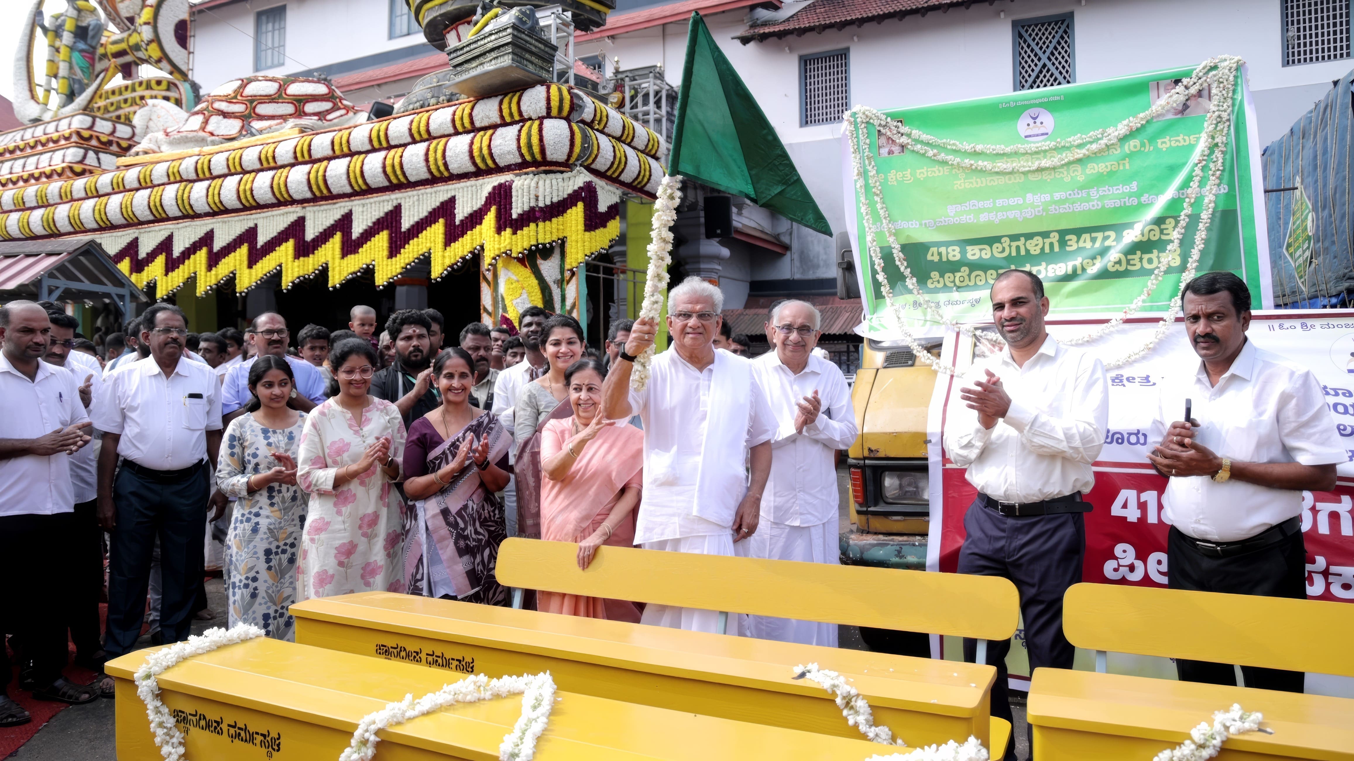 ಶ್ರೀ ಕ್ಷೇತ್ರ ಧರ್ಮಸ್ಥಳ ಗ್ರಾಮಾಭಿವೃದ್ಧಿ ಯೋಜನೆ ವತಿಯಿಂದ ಗುರುವಾರ ಧರ್ಮಸ್ಥಳದಲ್ಲಿ ಬೆಂಗಳೂರು ಗ್ರಾಮಾಂತರ, ಚಿಕ್ಕಬಳ್ಳಾಪುರ, ತುಮಕೂರು ಮತ್ತು ಕೋಲಾರ ಜಿಲ್ಲೆಗಳ 418 ಶಾಲೆಗಳಿಗೆ 3,472 ಜೊತೆ ಡೆಸ್ಕ್-ಬೆಂಚ್ಗಳ ವಿತರಣೆಗೆ ಚಾಲನೆ