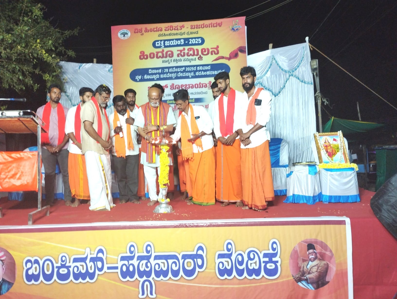 ಇದೇ ಸಂದರ್ಭದಲ್ಲಿ ಪುರೋಹಿತ ಚಂದ್ರಶೇಖರ ಐತಾಳ್ ಅವರನ್ನು ಸನ್ಮಾನಿಸಲಾಯಿತು. ಇದಕ್ಕೂ ಮೊದಲು ಬಜರಂಗದಳ, ವಿಶ್ವ ಹಿಂದೂಪರಿಷತ್ ಹಮ್ಮಿಕೊಂಡಿದ್ದ ಶೋಭಾ ಯಾತ್ರೆಗೆ ಬಸ್ತಿಮಠದಲ್ಲಿ ಪೀಠಾಧಿಪತಿ ಶ್ರೀ ಲಕ್ಷ್ಮೀಸೇನ ಭಟ್ಟಾರಕಸ್ವಾಮೀಜಿಗಳು ಚಾಲನೆ ನೀಡಿದರು. ಬಸ್ತಿಮಠದಿಂದ ಹೊರಟ ಶೋಭಾ ಯಾತ್ರೆ ಪ್ರವಾಸಿ ಮಂದಿರ ತಲುಪಿ ಕಾರ್ಯಕ್ರಮ ನಡೆಯುವ ಸ್ಥಳಕ್ಕೆ ಆಗಮಿಸಿತು. ಶೋಭಾ ಯಾತ್ರೆಯಲ್ಲಿ ದತ್ತ ವಿಗ್ರಹ ಹೊತ್ತ ವಾಹನ, ಉಡುಪಿ ಮಕ್ಕಳ ಕಲಾ ತಂಡದವರಿಂದ ಭಜನೆ, ನೃತ್ಯ ನಡೆಯಿತು.ಬೆಳಿಗ್ಗೆ ಪೇಟೆ ಆಂಜನೇಯಸ್ವಾಮಿ ದೇವಸ್ಥಾನದಲ್ಲಿ ದತ್ತ ಹೋಮ, ಸಾಮೂಹಿಕ ಸತ್ಯನಾರಾಯಣ ಪೂಜೆ ನಡೆಯಿತು.