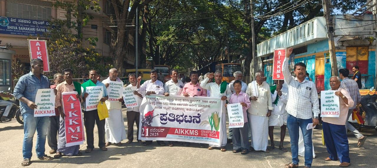 -21ಕೆಡಿವಿಜಿ1, 2:ಭತ್ತಕ್ಕೆ ₹3500, ಮೆಕ್ಕೆಜೋಳಕ್ಕೆ ₹3 ಸಾವಿರ ಬೆಂಬಲ ಬೆಲೆ ಘೋಷಿಸಿ, ಶೀಘ್ರ ಖರೀದಿ ಕೇಂದ್ರ ಸ್ಥಾಪಿಸಲ ಒತ್ತಾಯಿಸಿ ದಾವಣಗೆರೆಯಲ್ಲಿ ಶುಕ್ರವಾರ ಎಐಕೆಕೆಎಂಎಸ್ ನೇತೃತ್ವದಲ್ಲಿ ರೈತರು ಪ್ರತಿಭಟಿಸಿದರು.