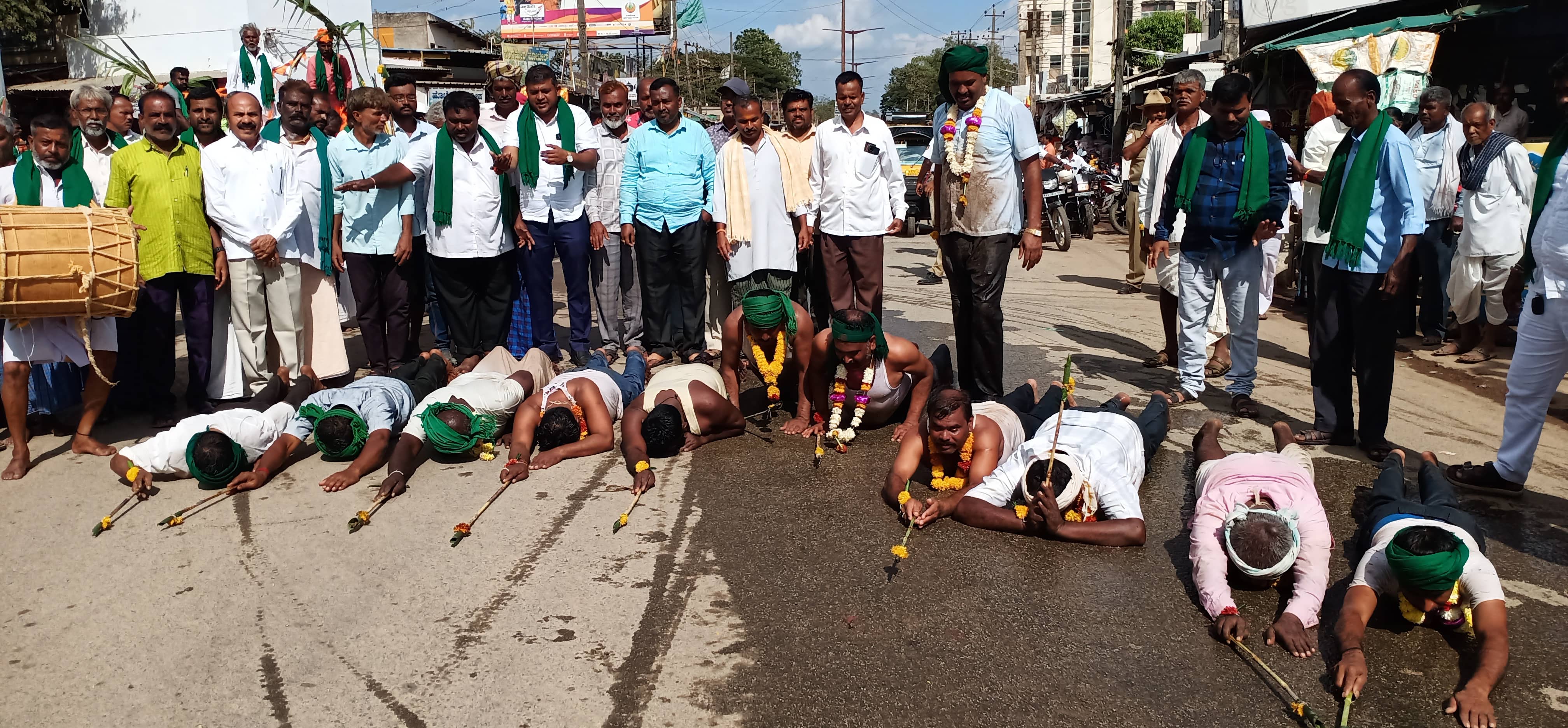 ಪಟ್ಟಣದ ಹಾವಳಿ ಹನಮಪ್ಪನ ದೇವಸ್ಥಾನದಿಂದ ಸೋಮವಾರ ರೈತಪರ ಹೋರಾಟಗಾರರು ದೀಡ್ ನಮಸ್ಕಾರ ಹಾಕುತ್ತ ಬಜಾರ್ ರಸ್ತೆಯ ಮೇಲೆ ಸಾಗಿ ಸರ್ಕಾರದ ವಿರುದ್ಧ ತಮ್ಮ ಆಕ್ರೋಶ ಹೊರಹಾಕಿದರು. ವಿಶೇಷ ಸಂದರ್ಭಗಳಲ್ಲಿ ದೇವರಿಗೆ ಭಕ್ತರು ದೀಡ್ ನಮಸ್ಕಾರ ಹಾಕುವುದು ವಾಡಿಕೆ. ಆದರೆ ಲಕ್ಷ್ಮೇಶ್ವರ ರೈತಪರ ಹೋರಾಟಗಾರರು ಗೋವಿನಜೋಳದ ಬೆಂಬಲ ಬೆಲೆ ಖರೀದಿ ಕೇಂದ್ರ ಆರಂಭಿಸಬೇಕು ಎನ್ನುವ ಆಗ್ರಹದೊಂದಿಗೆ ದೀಡ್ ನಮಸ್ಕಾರ ಹಾಕಿ ತಮ್ಮ ಆಕ್ರೋಶ ಹೊರಹಾಕಿದರು.ಈ ವೇಳೆ ಹೋರಾಟಗಾರರನ್ನು ಆದರಳ್ಳಿಯ ಗವಿಮಠದ ಡಾ. ಕುಮಾರ ಮಹಾರಾಜರು ಸತ್ಕರಿಸಿ ಮಾತನಾಡಿ, ಸರ್ಕಾರ ರೈತರ ಸಹನೆ ಪರೀಕ್ಷೆ ಮಾಡುವ ಕಾರ್ಯ ಮಾಡಬಾರದು. ರೈತರು ತಾವು ಬೆಳೆದ ಬೆಳೆಗೆ ಯೋಗ್ಯ ಬೆಲೆ ಕೇಳುವುದು ಅನ್ಯಾಯವಾ? ಬೆಂಬಲ ಬೆಲೆ ಖರೀದಿ ಕೇಂದ್ರ ಆರಂಭಿಸಿ ರೈತರ ಹಿತ ಕಾಪಾಡಬೇಕಾದ ಸರ್ಕಾರಗಳು ರೈತರ ಮಾರಕ ನೀತಿ ಅನುಸರಿಸುತ್ತಿರುವುದು ನೋವಿನ ಸಂಗತಿಯಾಗಿದೆ. ಬೇಡಿಕೆ ಈಡೇರುವುವರೆಗೆ ಸತ್ಯಾಗ್ರಹದಿಂದ ಹಿಂದೆ ಸರಿಯುವುದಿಲ್ಲ. ಹಲವರು ನನಗೆ ಬೆದರಿಕೆ ಹಾಕುತ್ತಿರುವುದು ರೈತರ ಪರವಾಗಿ ಕೆಲಸ ಮಾಡಿದವರಿಗೆ ಕೊಡುವ ಗೌರವವಾಗಿದೆ. ಇದಕ್ಕೆ ನಾವು ಹೆದರುವುದಿಲ್ಲ. ಪ್ರಾಣ ಹೋದರೂ ನಾನು ಅಂಜುವುದಿಲ್ಲ. ರೈತರ ಸಹನೆಯ ಕಟ್ಟೆಯೊಡೆಯುವ ಮೊದಲೇ ಖರೀದಿ ಕೇಂದ್ರ ಆರಂಭಿಸಬೇಕು ಎಂದು ಎಚ್ಚರಿಸಿದರು.