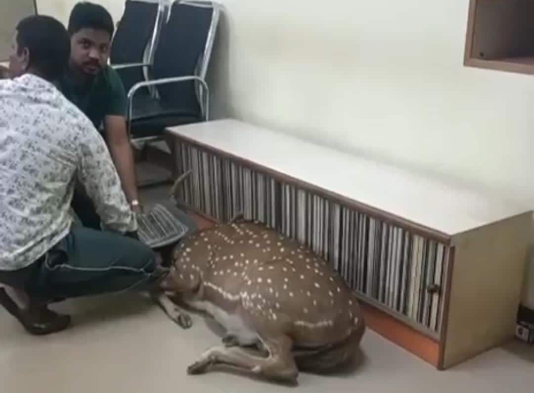 ಡಿಸಿಸಿ ಬ್ಯಾಂಕ್ಗೆ ನುಗ್ಗಿದ ಜಿಂಕೆಯನ್ನು ಅರಣ್ಯ ಇಲಾಖೆಯ ವನ್ಯಜೀವಿ ವಿಭಾಗದ ಸಿಬ್ಬಂದಿ ರಕ್ಷಣೆ ಮಾಡಿ ಕಾಡಿಗೆ ಬಿಟ್ಟಿದ್ದಾರೆ.