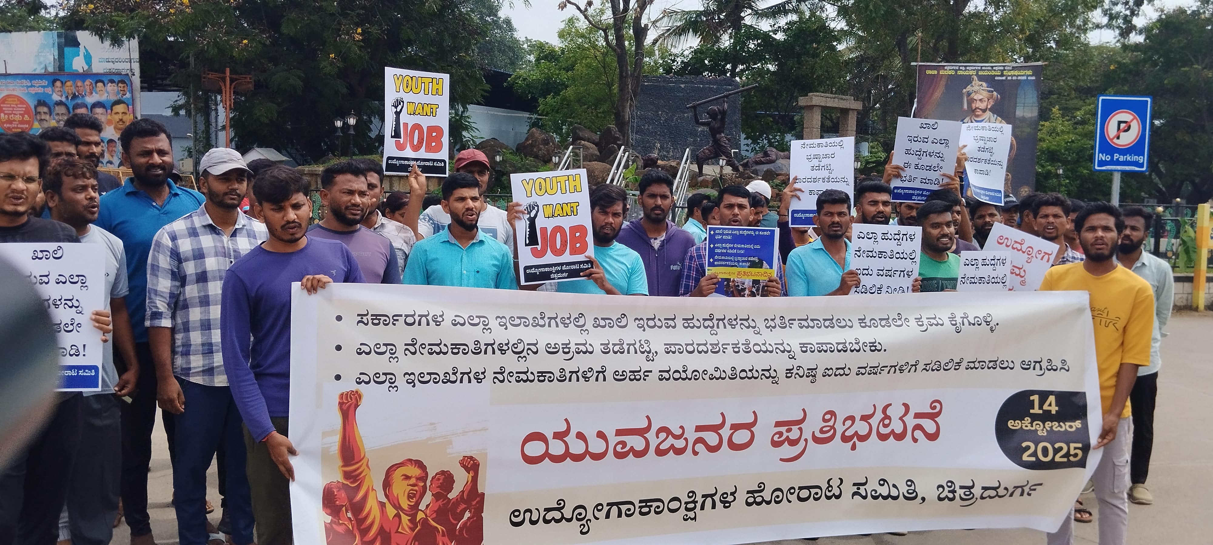 ಸರ್ಕಾರಗಳು ಯಾವುದೇ ನೆಪಗಳನ್ನು ಹೇಳದೆ, ಕೆಲವೇ ಹುದ್ದೆಗಳ ಭರ್ತಿಗೆ ಸೀಮಿತಗೊಳಿಸದೆ ಎಲ್ಲ ಖಾಲಿ ಹುದ್ದೆಗಳ ಭರ್ತಿಗೆ ಕೂಡಲೇ ತುರ್ತು ಕ್ರಮಗಳನ್ನು ಕೈಗೊಳ್ಳಬೇಕು. ನಾಲೈದು ವರ್ಷಗಳಿಂದ ನೇಮಕಾತಿಗಳು ನಡೆಯದ ಕಾರಣ ಅರ್ಹತಾ ವಯೋಮಿತಿಯಲ್ಲಿ ಕನಿಷ್ಠ ಐದು ವರ್ಷಗಳ ಸಡಿಲಿಕೆ ಮಾಡಬೇಕು. ಇಂತಹ ಪರಿಸ್ಥಿತಿಯಲ್ಲಿ ಇತ್ತೀಚಿಗೆ ಕೆಇಎ ಮೂಲಕ ಹೊರಡಿಸಿರುವ ಅಧಿಸೂಚನೆಯಲ್ಲಿ ವಿವಿಧ ಹುದ್ದೆಗಳಿಗೆ ದುಬಾರಿ ಅರ್ಜಿ ಶುಲ್ಕವನ್ನು ನಿಗದಿಪಡಿಸಿದ್ದು, ಅದನ್ನು ಕೂಡಲೇ ಕೈಬಿಡಬೇಕು ಎಂದು ಆಗ್ರಹಿಸಿದರು. ರವಿಕುಮಾರ್, ತಿಪ್ಪೇಸ್ವಾಮಿ, ಭವಾನಿ, ಕೊಟ್ರೇಶ್, ನಯನ, ರಘು, ಮಲ್ಲಿಕಾರ್ಜುನ್ ಮತ್ತಿತರರು ಪ್ರತಿಭಟನೆಯ ನೇತೃತ್ವ ವಹಿಸಿದ್ದರು.