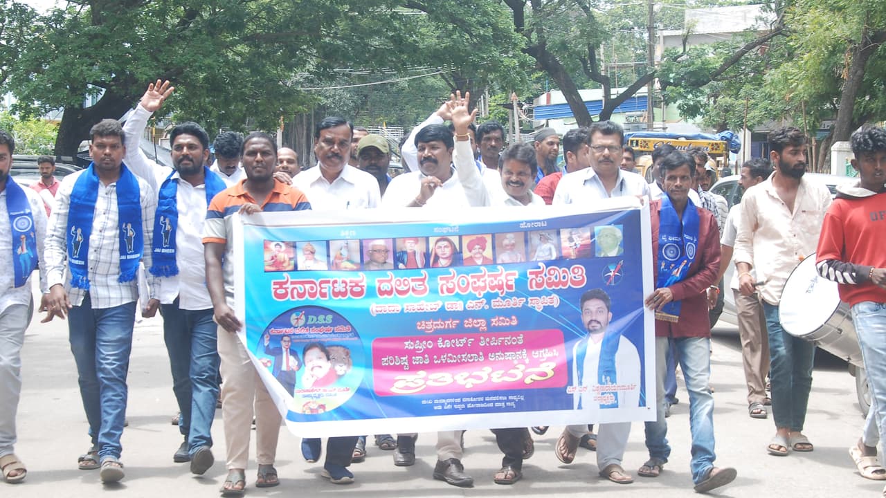 ಪರಿಶಿಷ್ಟರಿಗೆ ಒಳ ಮೀಸಲಾತಿ ಕಲ್ಪಿಸುವುದು ಸೇರಿದಂತೆ ವಿವಿಧ ಬೇಡಿಕೆಗಳ ಈಡೇರಿಕೆಗೆ ಆಗ್ರಹಿಸಿ ದಸಂಸ ಕಾರ್ಯಕರ್ತರು ಸೋಮವಾರ ಚಿತ್ರದುರ್ಗದಲ್ಲಿ ಪ್ರತಿಭಟನೆ ನಡೆಸಿ ಜಿಲ್ಲಾಧಿಕಾರಿ ಟಿ. ವೆಂಕಟೇಶ್ ಅವರಿಗೆ ಮನವಿ ಸಲ್ಲಿಸಿದರು.