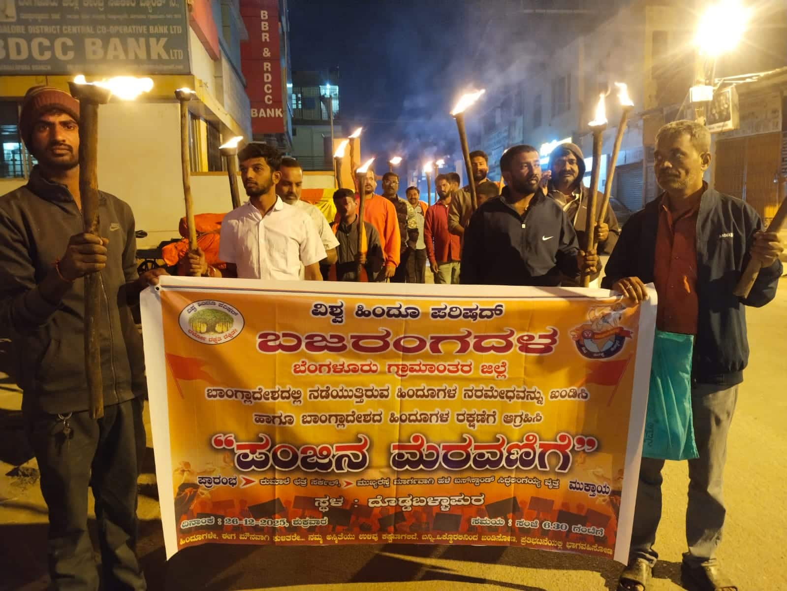 ವಿಶ್ವ ಹಿಂದೂ ಪರಿಷದ್, ಬಜರಂಗದಳ ಪದಾಧಿಕಾರಿಗಳಾದ ಶ್ರೀ ಕಾಂತ್, ರಮೇಶ್, ಅಗ್ನಿ ವೆಂಕಟೇಶ ಉಮೇಶ್, ವೆಂಕಟೇಶ, ಪುನೀತ್, ಮಧು , ಸೋಮು, ಕಿರಣ್, ಬಲರಾಮ್,ಮುನಿಕೃಷ್ಣ, ಮಹೇಶ್ ಬಾಬು, ರಾಹುಲ್ ಸೇರಿದಂತೆ ಕಾರ್ಯಕರ್ತರು ಇದ್ದರು.28ಕೆಡಿಬಿಪಿ2- ದೊಡ್ಡಬಳ್ಳಾಪುರ ನಗರದಲ್ಲಿ ವಿಶ್ವ ಹಿಂದೂ ಪರಿಷದ್, ಬಜರಂಗದಳ ಕಾರ್ಯಕರ್ತರು ಪಂಜಿನ ಮೆರವಣಿಗೆ ಮಾಡುವ ಬಾಂಗ್ಲಾದಲ್ಲಿ ನಡೆಯುತ್ತಿರುವ ಹಿಂದು ನರಮೇಧವನ್ನು ಖಂಡಿಸಿದರು.