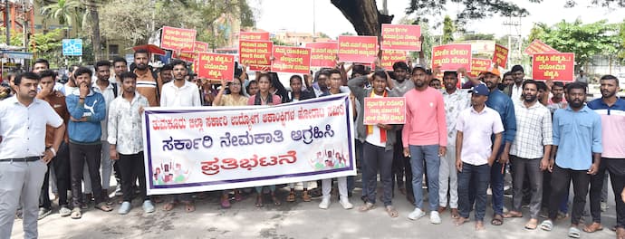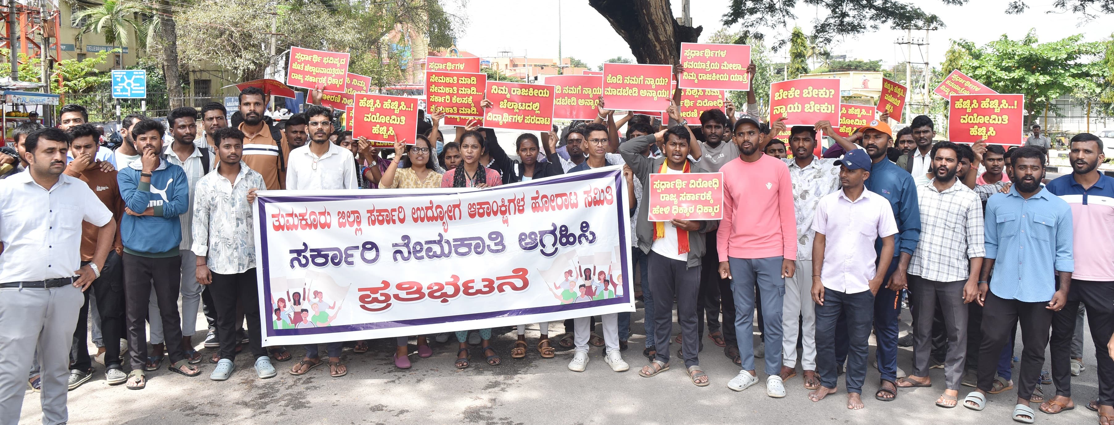 ಕನ್ನಡಪ್ರಭ ವಾರ್ತೆ, ತುಮಕೂರುಸರ್ಕಾರದ ವಿವಿಧ ಇಲಾಖೆಗಳಲ್ಲಿ ನೇಮಕಾತಿ ಹಾಗೂ ನೇಮಕಾತಿಗೆ ವಯೋಮಿತಿ ಹೆಚ್ಚಿಸುವಂತೆ ಆಗ್ರಹಿಸಿ ಜಿಲ್ಲಾ ಸರ್ಕಾರಿ ಉದ್ಯೋಗ ಆಕಾಂಕ್ಷಿಗಳ ಹೋರಾಟ ಸಮಿತಿ ವತಿಯಿಂದ ನಗರದಲ್ಲಿ ಪ್ರತಿಭಟನೆ ನಡೆಸಲಾಯಿತು. ನಗರದ ಟೌನ್ಹಾಲ್ ವೃತ್ತದಲ್ಲಿ ಸಮಾವೇಶಗೊಂಡ ಸಮಿತಿಯ ಪದಾಧಿಕಾರಿಗಳು ಪ್ರತಿಭಟನಾ ಮೆರವಣಿಗೆ ಮೂಲಕ ಜಿಲ್ಲಾಧಿಕಾರಿಗಳ ಕಚೇರಿ ತಲುಪಿ ಗೃಹ ಹಾಗೂ ಜಿಲ್ಲಾ ಉಸ್ತುವಾರಿ ಸಚಿವ ಡಾ. ಜಿ. ಪರಮೇಶ್ವರ್ ಅವರಿಗೆ ಮನವಿ ಸಲ್ಲಿಸಿ, ಶೀಘ್ರವಾಗಿ ಸರ್ಕಾರಿ ಇಲಾಖೆಗಳ ನೇಮಕಾತಿ ಪ್ರಕ್ರಿಯೆ ಆರಂಭಿಸಬೇಕು. ವಯೋಮಿತಿ ಹೆಚ್ಚಿಸಬೇಕು. ಕೆಇಎ ಹಾಗೂ ಕೆಪಿಎಸ್ಸಿ ಶುಲ್ಕ ಕಡಿಮೆ ಮಾಡಬೇಕು ಎಂಬ ಬೇಡಿಕೆಗಳನ್ನು ಸಚಿವರ ಮುಂದಿಟ್ಟರು.ರಾಜ್ಯದ ವಿವಿಧ ಇಲಾಖೆಗಳಲ್ಲಿ ಮತ್ತು ಪೊಲೀಸ್ ಇಲಾಖೆಯಲ್ಲಿ ಕಾನ್ಸ್ಟೇಬಲ್, ಪಿಎಸ್ಐ ಸೇರಿದಂತೆ ಹಲವು ಹುದ್ದೆಗಳಿಗೆ ವಯೋಮಿತಿ ಹೆಚ್ಚಿಸಿ ನೇಮಕಾತಿ ಆರಂಭಿಸುವಂತೆ ಸಮಿತಿಯ ಪ್ರತಿಭಟನಾನಿರತರು ಒತ್ತಾಯಿಸಿದರು.ಹಲವು ವರ್ಷಗಳು ಕಳೆದರೂ ಈವರೆಗೆ ಯಾವುದೇ ನೇಮಕಾತಿ ಆಗದೇ ಲಕ್ಷಾಂತರ ವಿದ್ಯಾರ್ಥಿಗಳು ತೊಂದರೆ ಅನುಭವಿಸುತ್ತಿದ್ದಾರೆ. ಶಿಕ್ಷಣ ಇಲಾಖೆಯಲ್ಲಿ ನೇಮಕಾತಿಯಾಗದೇ ಶಿಕ್ಷಕರ ಕೊರತೆ ಎದ್ದು ಕಾಣುತ್ತಿದೆ. ಏಳೆಂಟು ವರ್ಷಗಳಿಂದ ಎಫ್ಡಿಎ, ಎಸ್ಡಿಎ, ಪಶು ವೈದ್ಯರು, ಭೂ ಸರ್ವೇ ಸೇರಿದಂತೆ ಬಹುತೇಕ ೪೦ಕ್ಕೂ ಅಧಿಕ ಇಲಾಖೆಗಳಲ್ಲಿ ಸುಮಾರು ೨.೮೦ ಲಕ್ಷ ಸಾವಿರ ಹುದ್ದೆಗಳು ಖಾಲಿ ಇದ್ದರೂ ನೇಮಕಾತಿ ಮಾಡಿಲ್ಲ. ಆದ್ದರಿಂದ ಕೂಡಲೇ ರಾಜ್ಯ ಸರ್ಕಾರ ಸರ್ಕಾರಿ ಇಲಾಖೆಗಳಲ್ಲಿ ನೇಮಕಾತಿಯನ್ನು ಶೀಘ್ರವಾಗಿ ಆರಂಭಿಸುವ ಮೂಲಕ ನಿರುದ್ಯೋಗ ಸಮಸ್ಯೆಗಳನ್ನು ನಿವಾರಿಸಬೇಕು ಎಂದು ಪ್ರತಿಭಟನಾಕಾರರು ಆಗ್ರಹಿಸಿದರು.ಈ ಬಾರಿ ನಡೆಸಿದ ಕೆಎಎಸ್ ಪರೀಕ್ಷೆಯಲ್ಲಿ ಕನ್ನಡ ಭಾಷೆಯ ಅನುವಾದದಲ್ಲಿ ಸಾಕಷ್ಟು ತಪ್ಪುಗಳಿದ್ದು, ಅಭ್ಯರ್ಥಿಗಳು ಗೊಂದಲಕ್ಕೀಡಾಗಿದ್ದರು. ಆದ್ದರಿಂದ ಈ ಪರೀಕ್ಷೆಯನ್ನು ರದ್ದುಪಡಿಸಿ ಹೊಸ ಅಧಿಸೂಚನೆ ಹೊರಡಿಸಬೇಕು ಎಂದು ಒತ್ತಾಯಿಸಿದರು.ಸರ್ಕಾರದ ಅನೇಕ ಇಲಾಖೆಗಳಲ್ಲಿ ಹುದ್ದೆಗಳು ಖಾಲಿ ಇದ್ದರೂ ನೇಮಕಾತಿ ಆಗದ ಕಾರಣ ಸಾವಿರಾರು ವಿದ್ಯಾರ್ಥಿಗಳು ವಯೋಮಿತಿ ಮೀರಿದೆ. ವಯೋಮಿತಿ ಕನಿಷ್ಠ 5 ವರ್ಷ ಸಡಿಲಿಕೆ ಮಾಡಿ ತಕ್ಷಣ ನೇಮಕಾತಿ ಪ್ರಕ್ರಿಯೆ ಆರಂಭಿಸಬೇಕು ಎಂದು ಪ್ರತಿಭಟನಾನಿರತರು ಸಚಿವ ಡಾ. ಜಿ. ಪರಮೇಶ್ವರ್ ರವರಿಗೆ ಮನವಿ ಮಾಡಿದರು.ಪ್ರತಿಭಟನೆಯಲ್ಲಿ ಸುನೀಲ್, ಅಪ್ಪು ಪಾಟೀಲ್ ಸೇರಿದಂತೆ ಮತ್ತಿತರರು ಭಾಗವಹಿಸಿದ್ದರು.