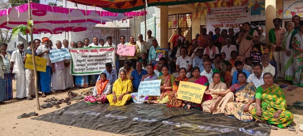ತಾಲೂಕಿನ ಗೆಜ್ಜಲಗೆರೆ ಗ್ರಾಮ ಸೇರಿದಂತೆ ನಾಲ್ಕು ಗ್ರಾಪಂಗಳನ್ನು ಮದ್ದೂರು ನಗರಸಭೆ ವ್ಯಾಪ್ತಿಗೆ ಸೇರ್ಪಡೆ ಮಾಡಿರುವುದನ್ನು ಕೈ ಬಿಡುವಂತೆ ಒತ್ತಾಯಿಸಿ ಗ್ರಾಪಂ ಹೋರಾಟ ಸಮಿತಿ ನೇತೃತ್ವದಲ್ಲಿ ಗ್ರಾಮದ ಜನಪ್ರತಿನಿಧಿಗಳು, ರೈತರು ಮತ್ತು ಗ್ರಾಮಸ್ಥರು ಸೋಮವಾರದಿಂದ ಗ್ರಾಪಂ ಎದುರು ಅನಿರ್ದಿಷ್ಟಾವಧಿ ಧರಣಿ ಸತ್ಯಾಗ್ರಹ ಆರಂಭಿಸಿದರು.ಗ್ರಾಪಂ ಆವರಣದಲ್ಲಿ ನಡೆಸುತ್ತಿರುವ ಸತ್ಯಾಗ್ರಹಕ್ಕೆ ಬುದ್ಧಿಜೀವಿಗಳು ಪ್ರಗತಿಪರ ಸಂಘಟನೆಗಳ ಮುಖಂಡರು ಹಾಗೂ ಮಹಿಳೆಯರು ಸ್ವಯಂ ಪ್ರೇರಿತವಾಗಿ ಪಾಲ್ಗೊಂಡು ಹೋರಾಟಕ್ಕೆ ಬೆಂಬಲ ಸೂಚಿಸಿದ್ದಾರೆ. ಶಾಮಿಯಾನ ಹಾಕಿ ಸ್ಥಳದಲ್ಲೇ ಅಡುಗೆ ಮಾಡಿ ಊಟ ಮಾಡುವ ಮೂಲಕ ಗೆಜ್ಜಲಗೆರೆ, ಗೊರವನಹಳ್ಳಿ, ಚಾಮನಹಳ್ಳಿ ಹಾಗೂ ಸೋಮನಹಳ್ಳಿ ಗ್ರಾಮ ಪಂಚಾಯ್ತಿಗಳನ್ನು ಮದ್ದೂರು ನಗರಸಭೆ ವ್ಯಾಪ್ತಿಗೆ ಸೇರ್ಪಡೆ ಮಾಡಿ ನಗರೀಕರಣ ಮಾಡಲು ಹೊರಟಿರುವ ರಾಜ್ಯ ಸರ್ಕಾರ, ಪೌರಾಡಳಿತ ನಿರ್ದೇಶನಾಲಯ ಹಾಗೂ ಕ್ಷೇತ್ರದ ಶಾಸಕ ಕೆ.ಎಂ.ಉದಯ್ ವಿರುದ್ಧ ಘೋಷಣೆ ಕೂಗಿ ಆಕ್ರೋಶ ವ್ಯಕ್ತಪಡಿಸಿದರು.