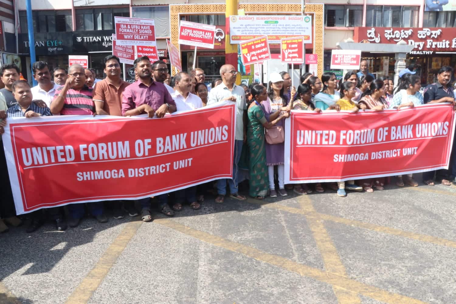 ದೇಶಾದ್ಯಂತ 10 ಲಕ್ಷಕ್ಕೂ ಹೆಚ್ಚು ಬ್ಯಾಂಕ್ ನೌಕರರು ತಮ್ಮ ಕೆಲಸವನ್ನು ಬಹಿಷ್ಕರಿಸಿ ತಮ್ಮ ನ್ಯಾಯಸಮ್ಮತ ಬೇಡಿಕೆಯಾದ ವಾರದಲ್ಲಿ 5 ದಿನಗಳು ಮಾತ್ರ ಕೆಲಸದಲ್ಲಿ ತೊಡಗಿಸಿಕೊಂಡು ಉಳಿದ 2 ದಿನಗಳ ರಜೆ ಜಾರಿ ಮಾಡಬೇಕು ಎಂದು ಪ್ರತಿಭಟನಾಕಾರರು ಒತ್ತಾಯಿಸಿದರಲ್ಲದೆ, ಸರ್ಕಾರದ ಬ್ಯಾಂಕಿಂಗ್ ವಿರೋಧಿ ನೀತಿಯನ್ನು ಖಂಡಿಸಿದರು.ಈ ಸಂದರ್ಭದಲ್ಲಿ ಮಾತನಾಡಿದ ಸಂಘದ ಸಮನ್ವಯಕಾರ ನೆಲ್ಸನ್, ವಾರದಲ್ಲಿ 5 ದಿನಗಳು ಮಾತ್ರ ಕೆಲಸದಲ್ಲಿ ತೊಡಗಿಸಿಕೊಂಡು ಉಳಿದ 2 ದಿನಗಳ ರಜೆ ಜಾರಿ ಮಾಡಬೇಕು. ಈ ಬಗ್ಗೆ ಹಲವು ಸುತ್ತಿನ ಮಾತುಕತೆಗಳು ನಡೆದಿದ್ದರೂ ಸಹ ಕೇಂದ್ರ ಸರ್ಕಾರದಿಂದ ಇನ್ನೂ ಅಂತಿಮ ಅನುಮೋದನೆ ದೊರೆತ್ತಿಲ್ಲ. ಈ ವಿಷಯವನ್ನು ಸೌಹಾರ್ಧಯುತವಾಗಿ ಬಗೆಹರಿಸುವ ಉದ್ದೇಶದಿಂದ ಯುಎಫ್ಬಿಯು ಹಲವಾರು ಬಾರಿ ರಾಜೀ ಸಂಧಾನ ಸಭೆಗಳಲ್ಲಿ ಭಾಗವಹಿಸಿ ಚರ್ಚೆ ನಡೆಸಿದೆ. ಆದರೆ, ಕೇಂದ್ರ ಸರ್ಕಾರದಿಂದ ಯಾವುದೇ ಸ್ಪಷ್ಟ ಭರವಸೆ ಲಭ್ಯವಾಗದ ಹಿನ್ನೆಲೆಯಲ್ಲಿ ಅನಿವಾರ್ಯವಾಗಿ ಈ ಮುಷ್ಕರ ನಡೆಸುತ್ತಿದ್ದೇವೆ ಎಂದರು.ಪ್ರಸ್ತುತ ಬ್ಯಾಂಕ್ಗಳು ಸಿಬ್ಬಂದಿಗಳ ಕೊರತೆ ನಡುವೆಯೂ ಬಹುತೇಕ ಎಲ್ಲಾ ಕೆಲಸಗಳನ್ನು ನಿರ್ವಹಿಸುತ್ತಿದ್ದಾರೆ. ಆಧುನಿಕ ಬ್ಯಾಂಕಿಂಗ್ ವ್ಯವಸ್ಥೆಯಲ್ಲಿ ಹಣಕಟ್ಟಲು, ಹಿಂಪಡೆಯುವ ಸೌಲಭ್ಯಗಳನ್ನು ಎಟಿಎಂನಲ್ಲಿ ಕಲ್ಪಿಸಲಾಗಿದೆ. ಆನ್ಲೈನ್ ಬ್ಯಾಂಕಿಂಗ್ ಉಪಯೋಗಿಸಬಹುದಾಗಿದೆ. ಈಗಾಗಲೇ ಕೇಂದ್ರ ಸರ್ಕಾರದ ನೌಕರರು ಇನ್ಸುರೆನ್ಸ್, ಆರ್.ಬಿ.ಐ. ಸೇರಿದಂತೆ ಹಲವು ಸಂಸ್ಥೆಗಳಲ್ಲಿ ವಾರಕ್ಕೆ 5 ದಿನ ಮಾತ್ರ ಕೆಲಸವಿದೆ. ಆದರೆ, ಸರ್ಕಾರದ ಎಲ್ಲಾ ಕಾರ್ಯಕ್ರಮಗಳನ್ನು ಜಾರಿಗೊಳಿಸುವ ಮತ್ತು ಸಾರ್ವಜನಿಕ ಸೇವೆಯಲ್ಲಿ ನಿರತರಾಗಿರುವ ಬ್ಯಾಂಕ್ ನೌಕರರಿಗೆ ಮಾತ್ರ ವಾರಪೂರ್ತಿ ಕೆಲಸ ಒತ್ತಡಕ್ಕೆ ಕಾರಣವಾಗುತ್ತಿದೆ ಎಂದು ದೂರಿದರು.ಬ್ಯಾಂಕುಗಳು 5 ದಿನ ಕೆಲಸ ನಿರ್ವಹಿಸಿದರೆ, ಗ್ರಾಹಕರಿಗೂ ಯಾವುದೇ ಸಮಸ್ಯೆ ಇರುವುದಿಲ್ಲ. ಇದು ಉತ್ತಮ ಬ್ಯಾಂಕಿಂಗ್ ವ್ಯವಸ್ಥೆಗೂ ಕಾರಣವಾಗುತ್ತದೆ. ಕೇವಲ ನೌಕರರಿಗೆ ಮಾತ್ರವಲ್ಲ ಆದ್ದರಿಂದ ಕೂಡಲೇ ಕೇಂದ್ರ ಸರ್ಕಾರ ಬ್ಯಾಂಕ್ ನೌಕರರ ಈ ಬೇಡಿಕೆಯನ್ನು ಈಡೇರಿಸಬೇಕು ಎಂದು ಅವರು ಆಗ್ರಹಿಸಿದರು.ಈ ಸಂದರ್ಭದಲ್ಲಿ ವಿವಿಧ ಸಂಘಟನೆಗಳ ಮುಖಂಡರಾದ ಪುನೀತ್ಕುಮಾರ್, ಕೆ.ಆರ್.ವಿಶ್ವನಾಥ್, ಹೊನ್ನಪ್ಪ, ಮಿಥುನ್ಕುಮಾರ್, ಸಾಗರ್ ಜೋಶಿ, ಬಿ.ಎಂ.ಮಂಜುನಾಥ್, ಮುರಳೀಧರ್, ಎಂ.ಎ.ಸಂತೋಷ್ಕುಮಾರ್, ಬಿ.ಎಸ್.ವಲ್ಲಭ , ಶಶಿಧರ್, ಧೀರಜ್ ಸೇರಿದಂತೆ ವಿವಿಧ ಬ್ಯಾಂಕ್ ಸಂಘಟನೆಗಳ ಪದಾಧಿಕಾರಿಗಳು ಮತ್ತು ಸಿಬ್ಬಂದಿ ಭಾಗವಹಿಸಿದ್ದರು.