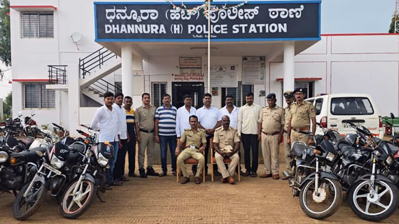 ಭಾಲ್ಕಿ ತಾಲೂಕಿನ ಧನ್ನೂರ (ಹೆಚ್) ಪೊಲೀಸ್ ಠಾಣೆಯಲ್ಲಿ ಬೈಕ್ ಕಳ್ಳರನ್ನು ಬಂಧಿಸಿ, ಕಳ್ಳರಿಂದ ವಶಪಡಿಸಿಕೊಂಡ ಬೈಕ್ಗಳೊಂದಿಗೆ ಪೊಲೀಸ್ ಅಧಿಕಾರಿಗಳು.