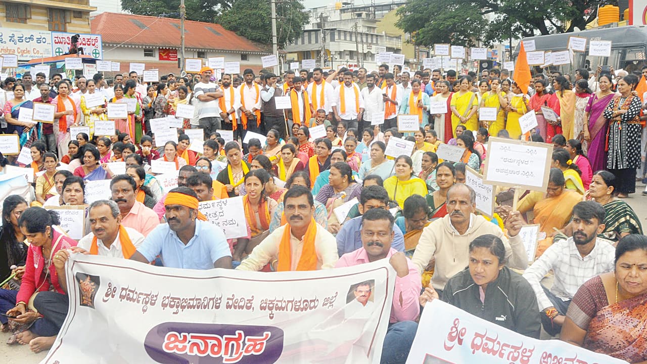 ಧರ್ಮಸ್ಥಳ ಹಾಗೂ ಧರ್ಮಸ್ಥಳದ ಧರ್ಮಾಧಿಕಾರಿ ಡಾ.ವೀರೇಂದ್ರ ಹೆಗ್ಗಡೆ ಹೆಸರಿಗೆ ಕಳಂಕ ತರುವ ಹಾಗೂ ಕೋಟ್ಯಂತರ ಭಕ್ತರ ಭಾವನೆಗೆ ಧಕ್ಕೆ ತರುವ ಕಾರ್ಯ ಮಾಡುತ್ತಿರುವವರ ವಿರುದ್ಧ ಕಠಿಣ ಕ್ರಮ ಕೈಗೊಳ್ಳಬೇಕು ಎಂದು ಆಗ್ರಹಿಸಿ 14ಕ್ಕೂ ಹೆಚ್ಚು ಜಿಲ್ಲೆಗಳಲ್ಲಿ ಬೃಹತ್ ಪ್ರತಿಭಟನೆ ನಡೆಸಿದರು.