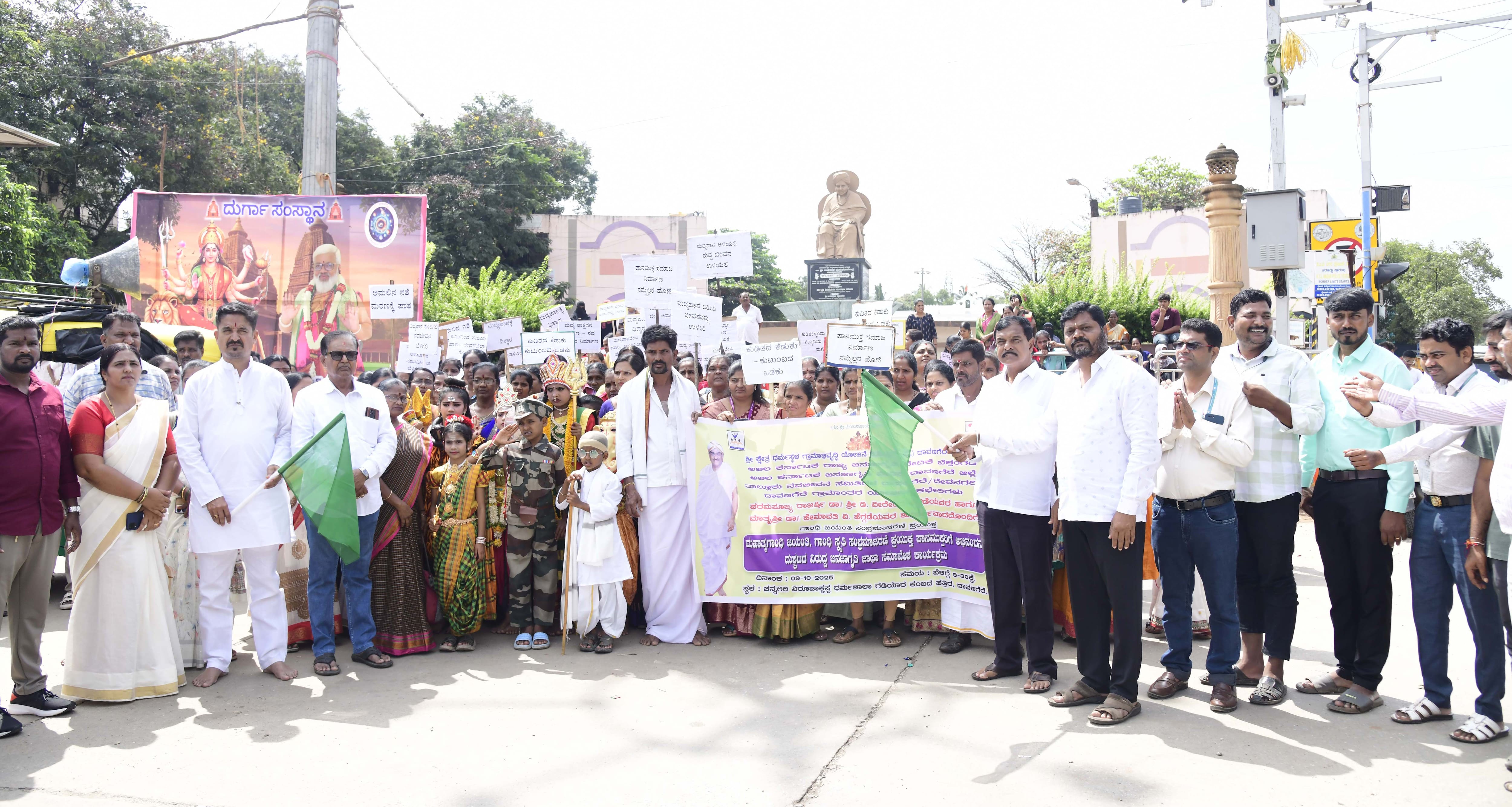 ಶ್ರೀ ಕ್ಷೇತ್ರ ಧರ್ಮಸ್ಥಳ ಗ್ರಾಮಾಭಿವೃದ್ಧಿ ಯೋಜನೆ ಬಿಸಿ ಟ್ರಸ್ಟ್, ಅಖಿಲ ಕರ್ನಾಟಕ ಜನಜಾಗೃತಿ ವೇದಿಕೆ ಟ್ರಸ್ಟ್, ಪ್ರಗತಿಬಂಧು ಸ್ವಸಹಾಯ ಸಂಘಗಳ ಒಕ್ಕೂಟ ಇವರ ಸಹಯೋಗದಲ್ಲಿ ಮಹಾತ್ಮಾ ಗಾಂಧಿ ಜಯಂತಿ, ಗಾಂಧಿ ಸ್ಮೃತಿ ಸಂಭ್ರಮಾಚರಣೆಯ ಪ್ರಯುಕ್ತ ಪಾನಮುಕ್ತರಿಗೆ ಅಭಿನಂದನೆ, ದುಶ್ಚಟದ ವಿರುದ್ಧ ಜನಜಾಗೃತಿ ಜಾಥಾ, ಸಮಾವೇಶವನ್ನು ಗುರುವಾರ ಇಲ್ಲಿನ ಗಡಿಯಾರ ಕಂಬದ ಬಳಿ ಇರುವ ಚನ್ನಗಿರಿ ವಿರೂಪಾಕ್ಷಪ್ಪ ಧರ್ಮಶಾಲೆಯಲ್ಲಿ ಹಮ್ಮಿಕೊಳ್ಳಲಾಗಿತ್ತು.ಆವರಗೊಳ್ಳ ಪುರವರ್ಗ ಹಿರೇಮಠದ ಶ್ರೀ ಓಂಕಾರ ಶಿವಾಚಾರ್ಯ ಸ್ವಾಮೀಜಿ ಕಾರ್ಯಕ್ರಮದ ಸಾನಿಧ್ಯವಹಿಸಿ ಮಾತನಾಡಿ, ಮಹಾತ್ಮ ಗಾಂಧೀಜಿಯವರ ಆದರ್ಶಗಳು, ತತ್ವಗಳನ್ನು ಪ್ರತಿಯೊಬ್ಬರೂ ಸಹ ತಮ್ಮ ಜೀವನದಲ್ಲಿ ಅಳವಡಿಸಿಕೊಳ್ಳಬೇಕು. ಈ ಧರ್ಮಸ್ಥಳ ಗ್ರಾಮಾಭಿವೃದ್ಧಿ ಯೋಜನೆ ಬಿಸಿ ಟ್ರಸ್ಟ್ನಿಂದ ವ್ಯಸನಮುಕ್ತ ಸಮಾಜ ಮಾಡುವ ನಿಟ್ಟಿನಲ್ಲಿ ಪಾನಮುಕ್ತರಿಗೆ ಅಭಿನಂದನೆ, ದುಶ್ಚಟದ ವಿರುದ್ಧ ಜನಜಾಗೃತಿ ಜಾಥಾ, ಸೇರಿದಂತೆ ಅನೇಕ ಜನ ಜಾಗೃತಿ, ಅರಿವು ಕಾರ್ಯಕ್ರಮಗಳನ್ನು ಹಮ್ಮಿಕೊಂಡಿದೆ ಎಂದರು.