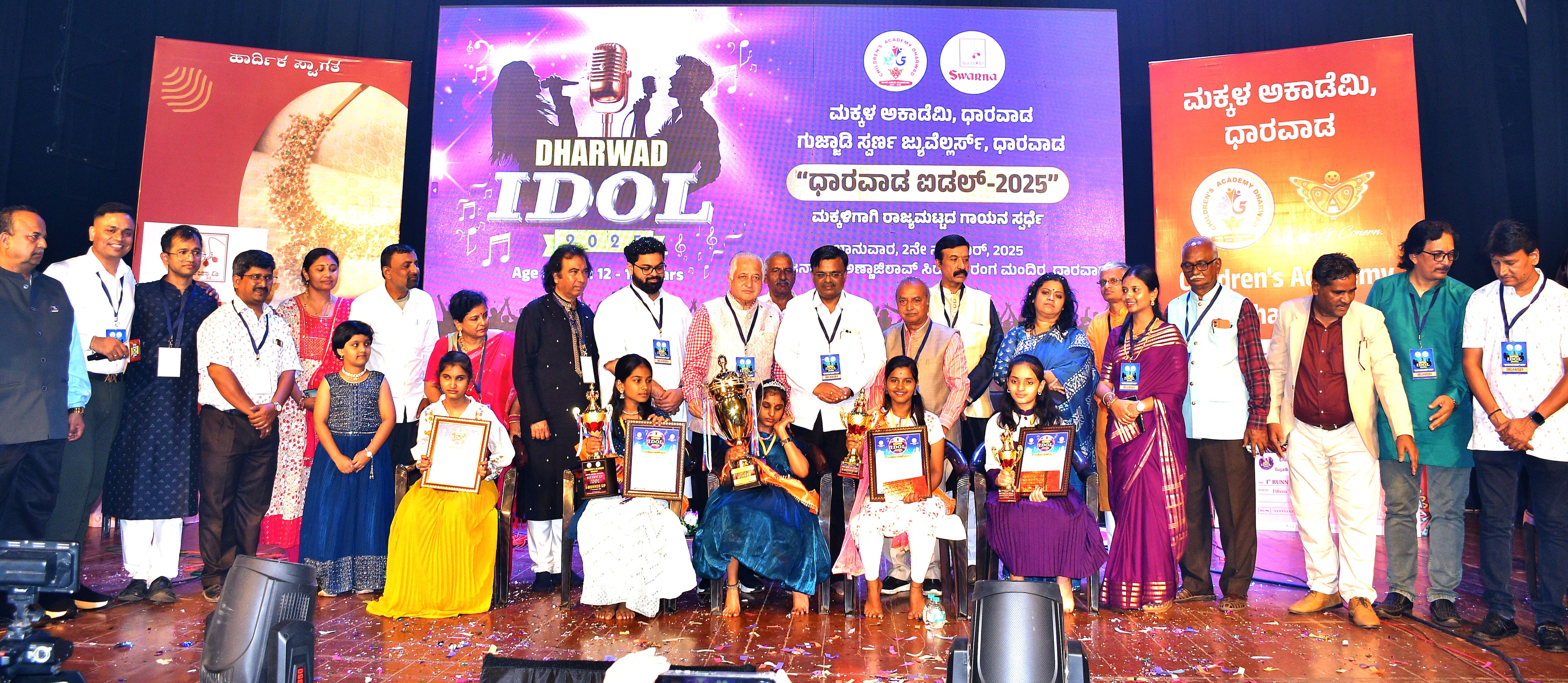 ಮಕ್ಕಳ ಅಕಾಡೆಮಿ ಆಯೋಜಿಸಿದ್ದ ಸಮಾರಂಭದಲ್ಲಿ ಹುಬ್ಬಳ್ಳಿಯ ರೇಣುಶ್ರೀ ಮಂಜುನಾಥ ಕೊಡ್ಲಿಗೆ ಧಾರವಾಡ ಐಡಲ್ ಗುಜ್ಜಾಡಿ ಸ್ವರ್ಣ ಟ್ರೋಫಿ ಹಾಗೂ ₹ 20 ಸಾವಿರ ನಗದು ಪುರಸ್ಕಾರ ಲಭಿಸಿದೆ.ಇಲ್ಲಿಯ ಸೃಜನಾ ರಂಗಮಂದಿರದಲ್ಲಿ ಮಕ್ಕಳ ಅಕಾಡೆಮಿಯು ರಜತ ಮಹೋತ್ಸವದ ನಿಮಿತ್ತ ಗುಜ್ಜಾಡಿ ಸ್ವರ್ಣ ಜುವೆಲರ್ಸ್ ಹಾಗೂ ಕುಮಾರೇಶ್ವರ ಕಲ್ಚರಲ್ ಸೊಸೈಟಿ ಸಹಯೋಗದಲ್ಲಿ ಏರ್ಪಡಿಸಿದ್ದ ಧಾರವಾಡ ಐಡಲ್–2025 ಗ್ರ್ಯಾಂಡ್ ಪಿನಾಲೆಯಲ್ಲಿ ಪ್ರಶಸ್ತಿ ಪ್ರದಾನ ಮಾಡಲಾಯಿತು.