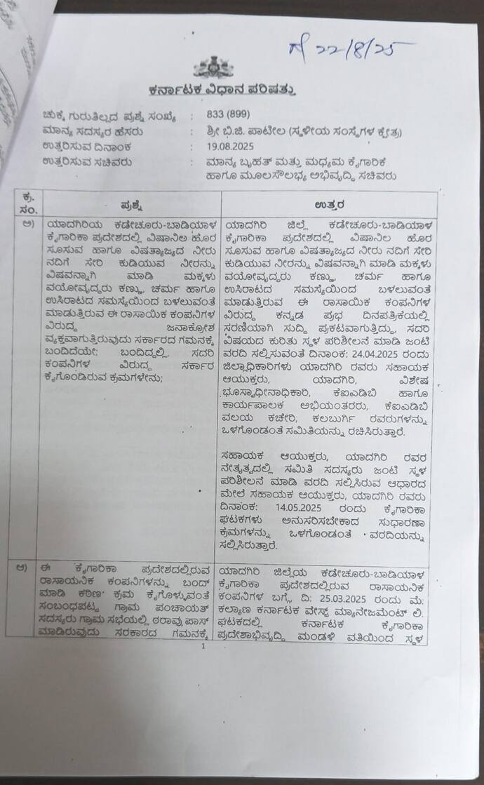 "ಯಾದಗಿರಿಯ ಕಡೇಚೂರು-ಬಾಡಿಯಾಳ ಕೈಗಾರಿಕಾ ಪ್ರದೇಶದಲ್ಲಿ ವಿಷಾನಿಲ ಹೊರಸೂಸುವ ಹಾಗೂ ವಿಷತ್ಯಾಜ್ಯದ ನೀರು ನದಿಗೆ ಸೇರಿ, ಕುಡಿಯುವ ನೀರನ್ನು ವಿಷವನ್ನಾಗಿ ಮಾಡಿ, ಮಕ್ಕಳು, ವಯೋವೃದ್ಧರು ಕಣ್ಣು, ಚರ್ಮ ಹಾಗೂ ಉಸಿರಾಟದ ಸಮಸ್ಯೆಯಿಂದ ಬಳಲುವಂತೆ ಮಾಡುತ್ತಿರುವ ಈ ರಾಸಾಯಿಕ ಕಂಪನಿಗಳ ವಿರುದ್ಧ ಜನಾಕ್ರೋಶ ವ್ಯಕ್ತವಾಗುತ್ತಿರುವುದು ಸರ್ಕಾರದ ಗಮನಕ್ಕೆ ಬಂದಿದೆಯೇ ? ಬಂದಿದ್ದಲ್ಲಿ, ಸದರಿ ಕಂಪನಿಗಳ ವಿರುದ್ಧ ಕೈಗೊಂಡಿರುವ ಕ್ರಮಗಳೇನು ? ಅಲ್ಲದೆ, ಈ ರಾಸಾಯನಿಕ ಕಂಪನಿಗಳನ್ನು ಬಂದ್ ಮಾಡಿ, ಕಠಿಣ ಕ್ರಮಕ್ಕೆ ಆಗ್ರಹಿಸಿ ಗ್ರಾಮ ಪಂಚಾಯತ್ಗಳು ಠರಾವು ಪಾಸ್ ಮಾಡಿರುವ ಬಗ್ಗೆಯೂ ಶಾಸಕ ಬಿ.ಜಿ.ಪಾಟೀಲ್ ಅವರು ಪ್ರಶ್ನಿಸಿದ್ದಾರೆ.ಲಿಖಿತ ಉತ್ತರದಲ್ಲಿ, "ಕನ್ನಡಪ್ರಭ " ಸರಣಿ ವರದಿಗಳನ್ನು ಉಲ್ಲೇಖಿಸಲಾಗಿದ್ದು, ಅದರಂತೆ ಸಹಾಯಕ ಆಯುಕ್ತರ ನೇತೃತ್ವದಲ್ಲಿ ಸಮಿತಿ ರಚನೆ, ಭೇಟಿ- ಪರಿಶೀಲನೆ ಹಾಗೂ ಸುಧಾರಣಾ ಕ್ರಮಗಳ ಬಗ್ಗೆ ತಿಳಿಸಲಾಗಿದೆಯಲ್ಲದೆ, ದುರ್ವಾಸನೆ ತಡೆಗಟ್ಟಲು ಕೈಗಾರಿಕಾ ಪ್ರದೇಶದಲ್ಲಿ ಸುಗಂಧದ್ರವ್ಯ ಸಿಂಪರಣೆಗೆ ಸೂಚಿಸಿರುವ ಬಗ್ಗೆ ತಿಳಿಸಲಾಗಿದೆ. ಸರ್ಕಾರ ನೀಡಿದ ಉತ್ತರಕ್ಕೂ, ಅಲ್ಲಿನ ವಾಸ್ತವಕ್ಕೂ ಅಜಗಜಾಂತರ ವ್ಯತ್ಯಾಸ ಹಾಗೂ ವಾಸ್ತವಾಂಶಗಳ ಮರೆಮಾಚಿ ಶಾಸಕರಿಗೆ ಅರೆಬರೆ ಮಾಹಿತಿ ನೀಡಿರುವುದನ್ನು ನೋಡಿದರೆ, ಸಾಮಾನ್ಯ ನಾಗರಿಕರಿಗೆ ಅದ್ಯಾವ ರೀತಿ ಸರ್ಕಾರ ಸ್ಪಂದಿಸುತ್ತಿದೆಯೋ ದೇವರೇ ಬಲ್ಲ.!