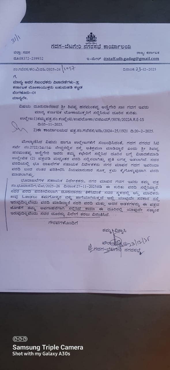 ಕ್ರಿಮಿನಲ್ ಕೇಸ್: ಸಾರ್ವಜನಿಕ ರಸ್ತೆಯನ್ನು ಅತಿಕ್ರಮಿಸಿದವರ ವಿರುದ್ಧ ಕ್ರಿಮಿನಲ್ ಪ್ರಕರಣ ದಾಖಲಿಸಬೇಕು. ಪ್ರಭಾವಿಗಳ ರಕ್ಷಣೆಯಿಂದಲೇ ತಪ್ಪಿತಸ್ಥರ ಮೇಲೆ ಯಾವುದೇ ಕ್ರಮವಾಗುತ್ತಿಲ್ಲ. ನಮಗೆ ಒತ್ತಡವಿದೆ ಎಂದು ಹಲವಾರು ಅಧಿಕಾರಿಗಳು ತಮ್ಮ ಅಸಹಾಯಕತೆ ತೋಡಿಕೊಳ್ಳುತ್ತಿದ್ದಾರೆ. ಯಾವುದೇ ತಪ್ಪು ಮಾಡದ, ಏನೂ ಅರಿಯದ ಜನರಿಗೆ ಈ ರೀತಿ ನಿರಂತರ ತೊಂದರೆಯಾದರೆ ಯಾರ ಬಳಿ ನಮ್ಮ ಸಮಸ್ಯೆ ಹೇಳುವುದು ಎನ್ನುವುದೇ ತಿಳಿಯದಾಗಿದೆ ಎಂದು ತೊಂದರೆಗೊಳಗಾದ ವ್ಯಕ್ತಿ ಶಿವಕುಮಾರ ಅಣ್ಣಿಗೇರಿ ತಿಳಿಸಿದರು.ಮತ್ತೆ ಸರ್ವೇ: ಅತಿಕ್ರಮಣದ ಬಗ್ಗೆ ದೂರು ಬಂದಿದೆ. ಈ ಹಿಂದಿನ ಸರ್ವೇ ವರದಿಯಲ್ಲಿ ಅತಿಕ್ರಮಣ ಇಲ್ಲ ಎಂದು ತಿಳಿಸಲಾಗಿದೆ. ಈಗ ಮತ್ತೆ ಸರ್ವೇ ನಡೆಸಿ ವರದಿಯನ್ನು ಲೋಕಾಯುಕ್ತಕ್ಕೆ ಕಳುಹಿಸಲಾಗುವುದು ಎಂದು ನಗರಸಭೆ ಆಯುಕ್ತ ರಾಜಾರಾಮ ಪವಾರ ತಿಳಿಸಿದರು.