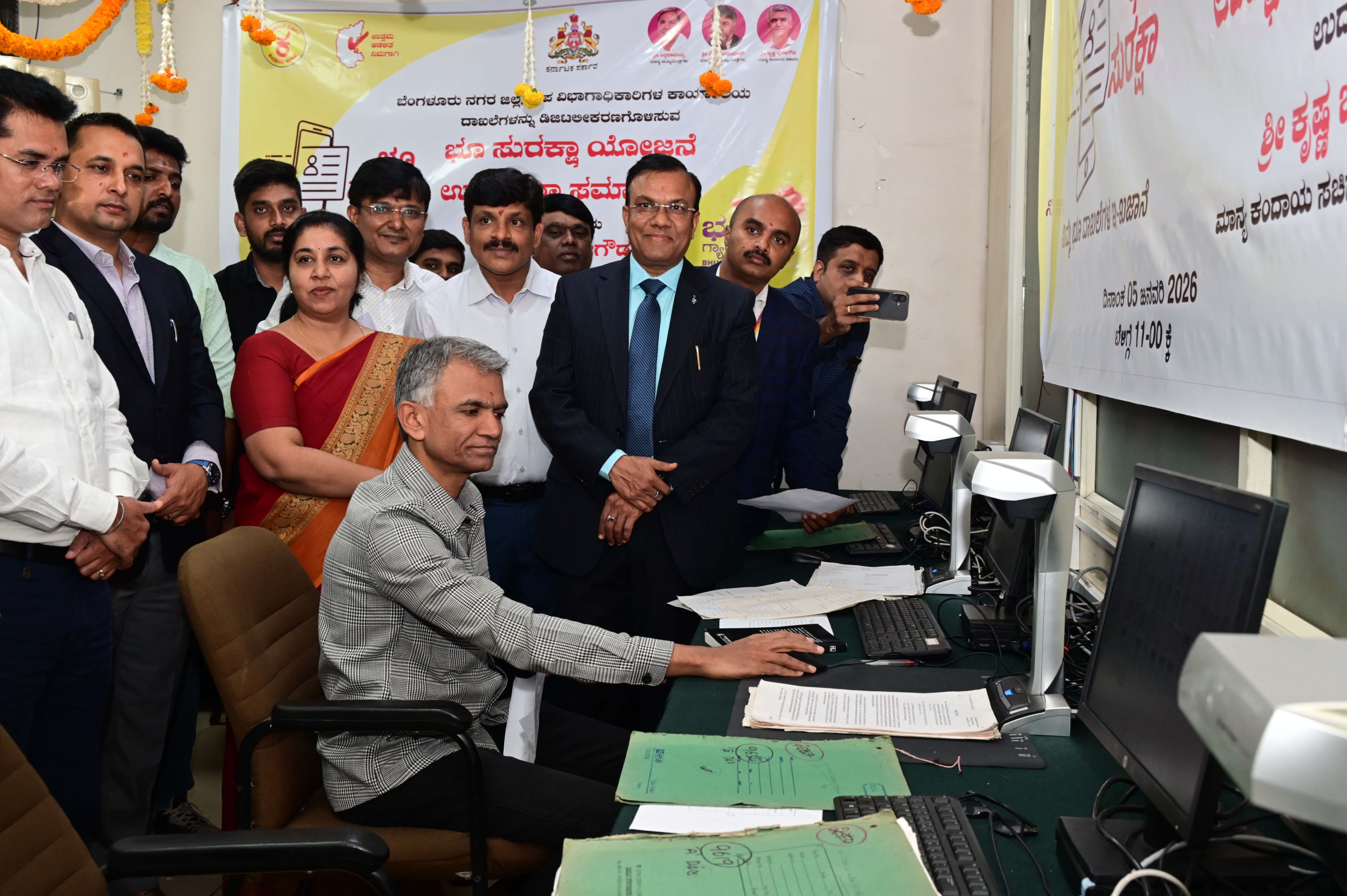 ರಾಜ್ಯದಲ್ಲಿ ಭೂ ದಾಖಲೆಗಳ ಸಂಪೂರ್ಣ ಡಿಜಿಟಲೀಕರಣ ಮಾಡುವ ‘ಭೂ ಸುರಕ್ಷಾ ಯೋಜನೆ’ ಭಾಗವಾಗಿ ಉಪ ವಿಭಾಗಾಧಿಕಾರಿ ಹಾಗೂ ಜಿಲ್ಲಾಧಿಕಾರಿ ಕಚೇರಿಯಲ್ಲಿರುವ ದಾಖಲೆಗಳನ್ನು ಸ್ಕ್ಯಾನಿಂಗ್ ಮಾಡುವ ಕಾರ್ಯಕ್ಕೆ ಕಂದಾಯ ಸಚಿವ ಕೃಷ್ಣ ಬೈರೇಗೌಡ ಸೋಮವಾರ ಚಾಲನೆ ನೀಡಿದರು.ಭೂ ಸುರಕ್ಷಾ ಯೋಜನೆ ಅಡಿ ಕಳೆದ ವರ್ಷ ಜನವರಿಯಲ್ಲಿ ಎಲ್ಲಾ ತಾಲೂಕು ಕಚೇರಿಗಳ ಮೂಲ ಭೂ ದಾಖಲೆಗಳನ್ನೂ ಸ್ಕ್ಯಾನ್ ಮಾಡಿ ಡಿಜಿಟಲೀಕರಣ ಮಾಡುವ ಕೆಲಸಕ್ಕೆ ಚಾಲನೆ ನೀಡಲಾಗಿತ್ತು.