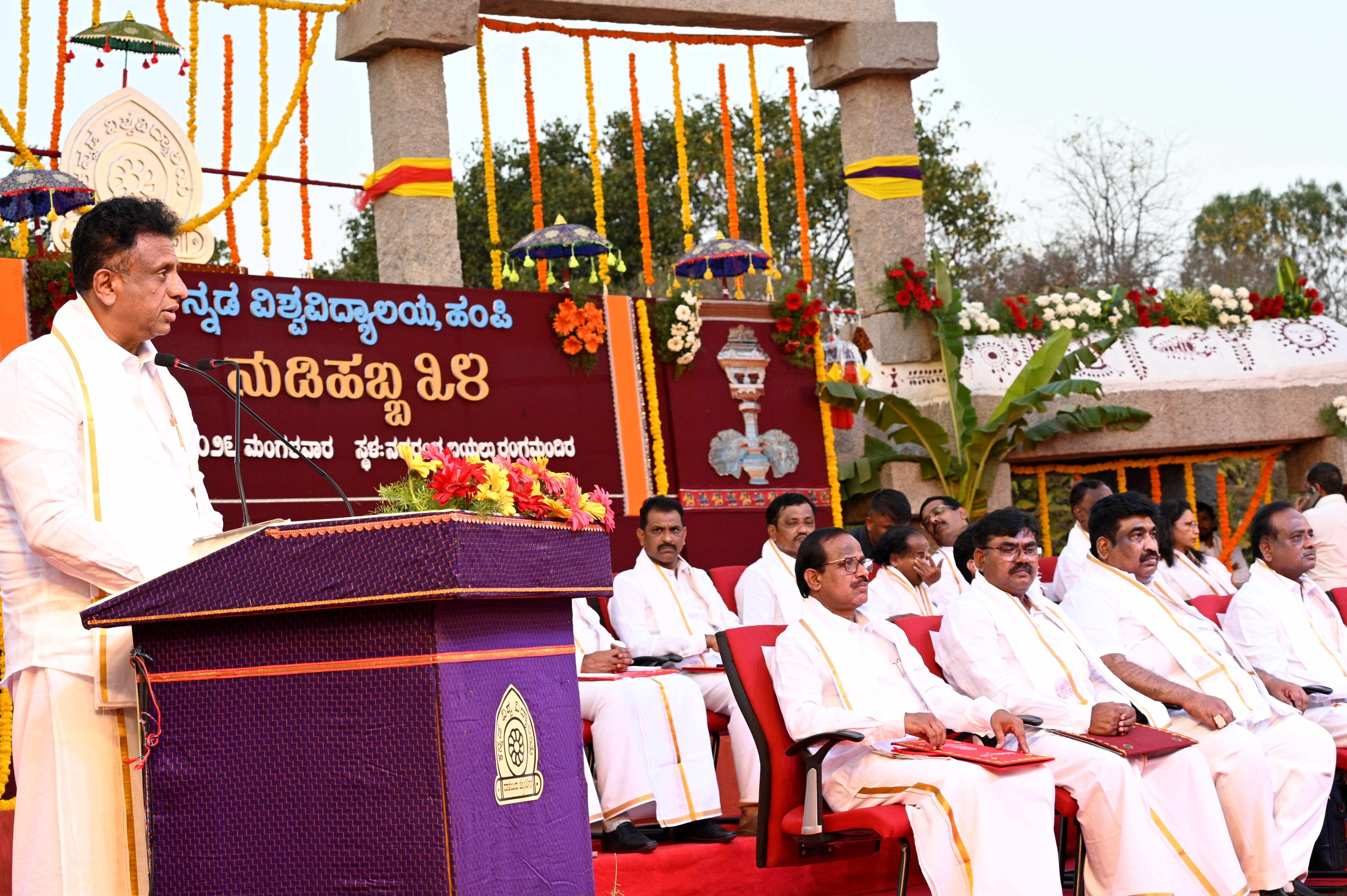 ಹಂಪಿ ಕನ್ನಡ ವಿಶ್ವವಿದ್ಯಾಲಯದಲ್ಲಿ ಮಂಗಳವಾರ ಸಂಜೆ 34ನೇ ನುಡಿಹಬ್ಬದಲ್ಲಿ ಪಿಎಚ್ಡಿ ಪದವಿಗಳನ್ನು ಪ್ರದಾನ ಮಾಡಿ ಮಾತನಾಡಿದರು. ವಿವಿಯ ನಾಲ್ಕು ನಿಕಾಯಗಳ ಹಲವು ವಿಭಿನ್ನ ಅಧ್ಯಯನ ವಿಭಾಗಗಳು, ಅಲ್ಲಿನ ವಿದ್ವಾಂಸರು ಬಹುಶಿಸ್ತೀಯ ಹಾಗೂ ಅಂತರ್ಶಿಸ್ತೀಯ ಅಧ್ಯಯನಗಳ ಮೂಲಕ ಹಲವು ಮಹತ್ವದ ಅಧ್ಯಯನಗಳನ್ನು ಈ ಮೂವತ್ನಾಲ್ಕು ವರ್ಷಗಳ ಕಾಲ ನಿರ್ವಹಿಸಿ, ಕನ್ನಡ, ಕರ್ನಾಟಕ ಸಂಸ್ಕೃತಿಯ ಶ್ರೀಮಂತಿಕೆಯನ್ನು ಹೆಚ್ಚಿಸಿದ್ದಾರೆ. ಉಪೇಕ್ಷಿತ ನೆಲೆಗಳ ಅಧ್ಯಯನಗಳನ್ನು ಮುನ್ನೆಲೆಗೆ ತರುವ ಮೂಲಕ ಕರ್ನಾಟಕಕ್ಕೆ ಹೊಸ ಚಿಂತನಾಕ್ರಮವನ್ನು ಕೊಟ್ಟಿದ್ದಾರೆ ಎಂದರು.ಇಂತಹ ಅಮೋಘ ಸಾಧನೆ ಮಾಡಿದ ಹೆಮ್ಮೆಯ ವಿಶ್ವವಿದ್ಯಾಲಯ ಅನುದಾನದ ಕೊರತೆಯಿಂದ ತನ್ನ ಸಂಶೋಧನೆ ಅಭಿವೃದ್ಧಿ ಹಾಗೂ ನಿರ್ವಹಣೆ ಚಟುವಟಿಕೆಗೆ ಸಂಕಷ್ಟ ಎದುರಿಸುತ್ತಿರುವುದನ್ನು ಕೇಳಿದ್ದೇನೆ. ಸ್ವತಃ ಕುಲಪತಿಗಳಾದ ಡಾ. ಡಿ.ವಿ. ಪರಮಶಿವಮೂರ್ತಿಯವರು ಆರ್ಥಿಕ ಸಂಕಷ್ಟಗಳಿಂದಾಗಿ ಉದ್ಭವಿಸಿರುವ ಇಲ್ಲಿನ ಪರಿಣಾಮಗಳನ್ನು ನನ್ನೊಂದಿಗೆ ಹಂಚಿಕೊಂಡಿದ್ದಾರೆ. ಸಾಧ್ಯವಾದಷ್ಟು ಶೈಕ್ಷಣಿಕ ಮತ್ತು ಆರ್ಥಿಕ ಆಡಚಣೆಗಳನ್ನು ಮೀರಿ ಇಂದು ವಿಶ್ವವಿದ್ಯಾಲಯ ಮುನ್ನಡೆಯುತ್ತಿದೆ. ಇದಕ್ಕೆ ಕಾರಣರಾದ ಡಾ. ಡಿ.ವಿ. ಪರಮಶಿವಮೂರ್ತಿ ಹಾಗೂ ಎಲ್ಲ ಪ್ರಾಧ್ಯಾಪಕರನ್ನೂ ಆಡಳಿತ ಸಿಬ್ಬಂದಿಯನ್ನೂ ಅಭಿನಂದಿಸುತ್ತೇನೆ. ಬೋಧಕ ಮತ್ತು ಆಡಳಿತ ಸಿಬ್ಬಂದಿಗಳು ಹೆಚ್ಚಿನ ಸಂಖ್ಯೆಯಲ್ಲಿ ನಿವೃತ್ತಿ ಹೊಂದುತ್ತಿರುವ ವಿಷಯ ಕುಲಪತಿಗಳಿಂದ ತಿಳಿಯಿತು. ಮುಖ್ಯಮಂತ್ರಿಗಳೊಂದಿಗೆ ಈ ಕುರಿತು ಗಂಭೀರವಾಗಿ ಚರ್ಚಿಸಿ ಸಾಧ್ಯವಾದಷ್ಟು ಸಮಸ್ಯೆ ಪರಿಹಾರಕ್ಕೆ ಪ್ರಾಮಾಣಿಕ ವಾಗಿ ಪ್ರಯತ್ನಿಸುವೆ ಎಂದು ಅವರು ಹೇಳಿದರು.