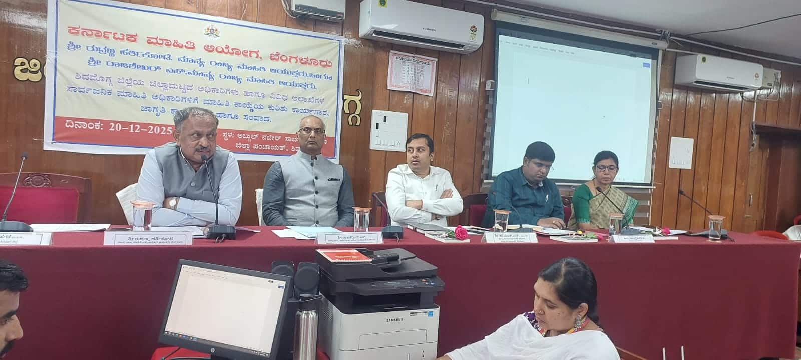 ಶಿವಮೊಗ್ಗ ಜಿಲ್ಲಾ ಪಂಚಾಯಿತಿ ಸಭಾಂಗಣದಲ್ಲಿ ಶನಿವಾರ ಕರ್ನಾಟಕ ಮಾಹಿತಿ ಆಯೋಗವು ಜಿಲ್ಲೆಯ ಜಿಲ್ಲಾಮಟ್ಟದ ಅಧಿಕಾರಿಗಳು ಹಾಗೂ ವಿವಿಧ ಇಲಾಖೆಗಳ ಸಾರ್ವಜನಿಕ ಮಾಹಿತಿ ಅಧಿಕಾರಿಗಳಿಗೆ ಮಾಹಿತಿ ಹಕ್ಕು ಕಾಯ್ದೆ ಕುರಿತು ಏರ್ಪಡಿಸಿದ್ದ ಕಾರ್ಯಾಗಾರ ಜಾಗೃತಿ ಕಾರ್ಯಕ್ರಮ ಮತ್ತು ಸಂವಾದ ಕಾರ್ಯಕ್ರಮದಲ್ಲಿ ಮಾಹಿತಿ ಆಯೋಗ ಆಯುಕ್ತ ರುದ್ರಣ್ಣ ಹರ್ತಿಕೋಟೆ ಮಾತನಾಡಿದರು.